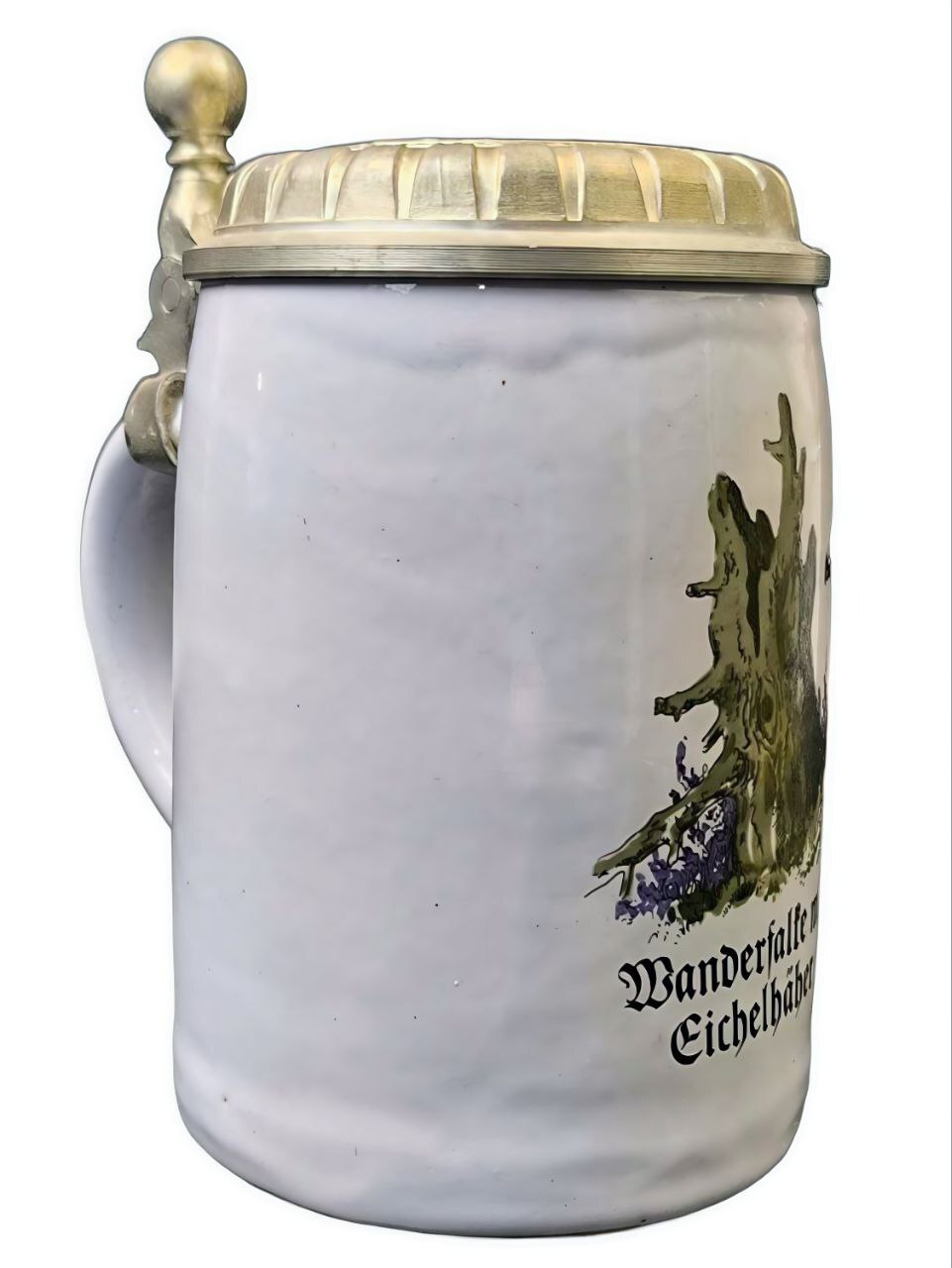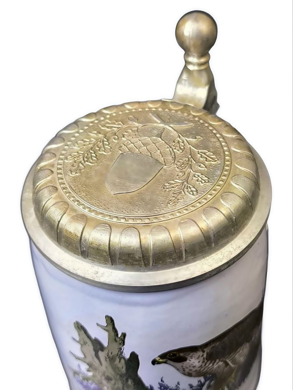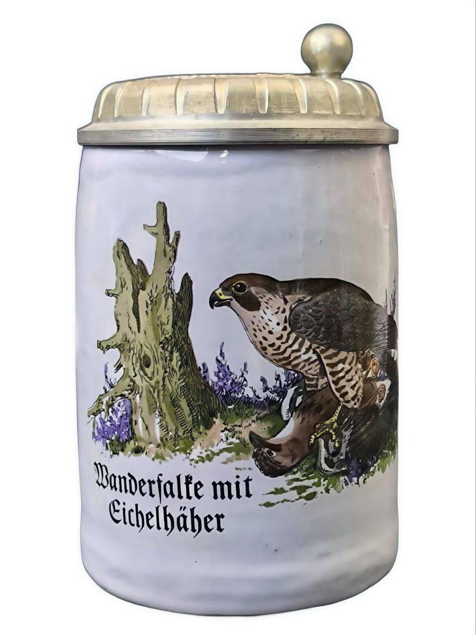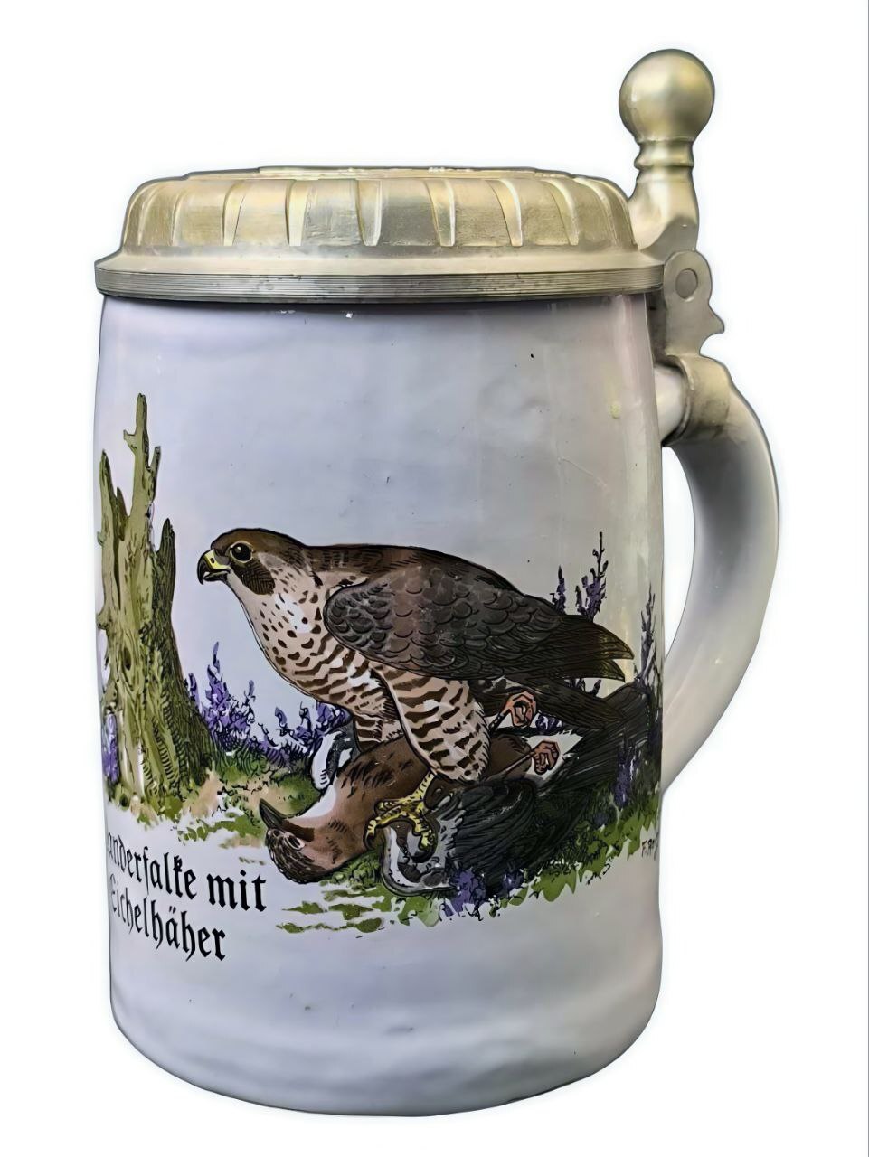 Кружка изготовлена из фарфора, украшена декором и оловянной крышкой. На кружке изображен рисунок сапсана (нем. "Der Falke"), хищная птица, которая держит в лапах свою добычу – сойку (нем. "Eichelhäber"). Надпись на немецком языке подтверждает этот сюжет.