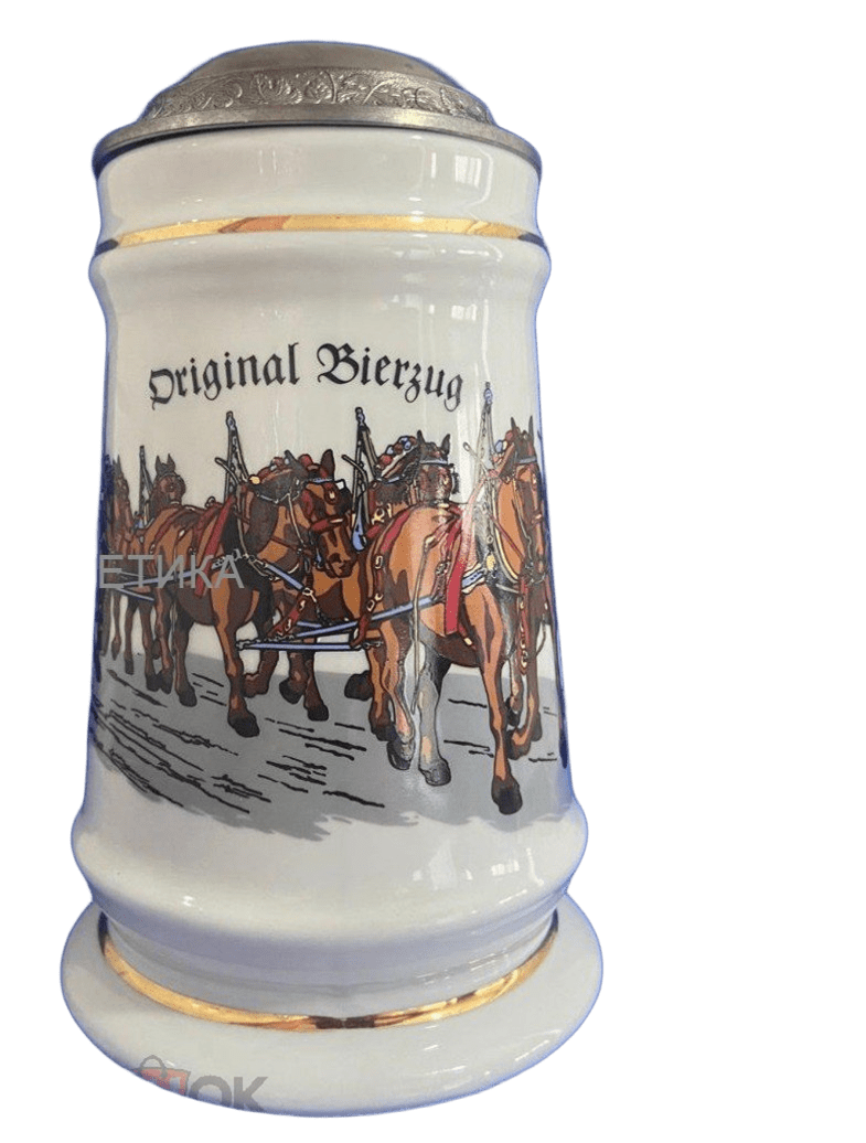 Кружка изготовлена из фарфора, украшена декором и оловянной крышкой. Эта винтажная пивная кружка GERZ – настоящая находка для любого коллекционера пива. Изготовленная в Германии, эта кружка с крышкой украшена красивым изображением лошадей, в частности, клейдесдальских лошадей, тянущих пивной кабан.