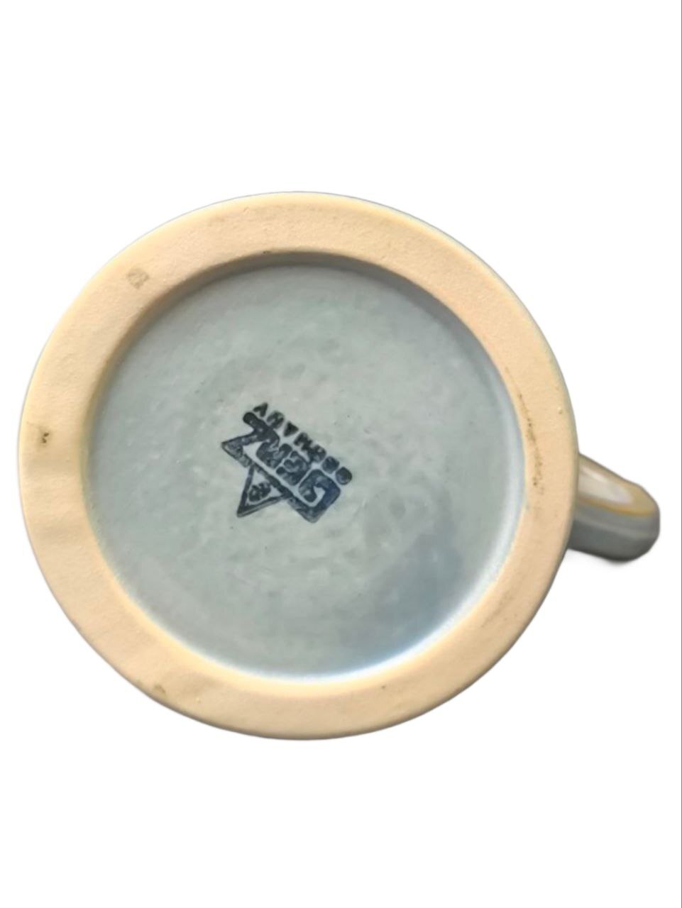 Кружка изготовлена из фарфора, украшена декором и оловянной крышкой. Кружка выполнена в технике рельефа и украшена детализированным, раскрашенным вручную изображением замка Нойшванштайн, расположенного среди заснеженных альпийских гор.