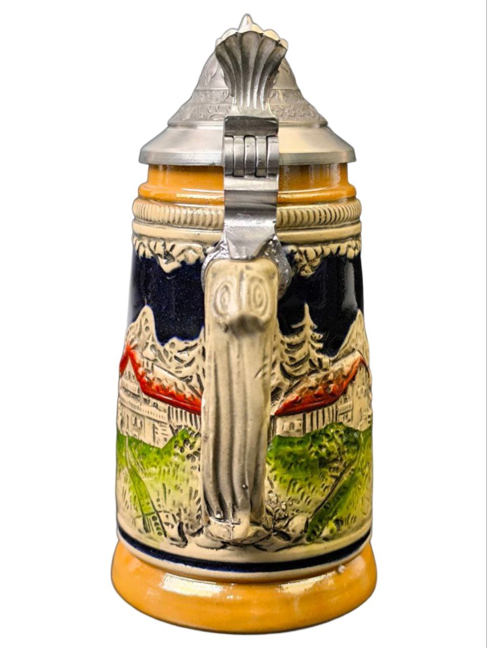 Это керамическая пивная кружка в немецком стиле (штайн) с оловянной крышкой, посвященная Люксембургу. На ней изображен живописный вид на город, включая реку и мост, а также надпись "Luxembourg".