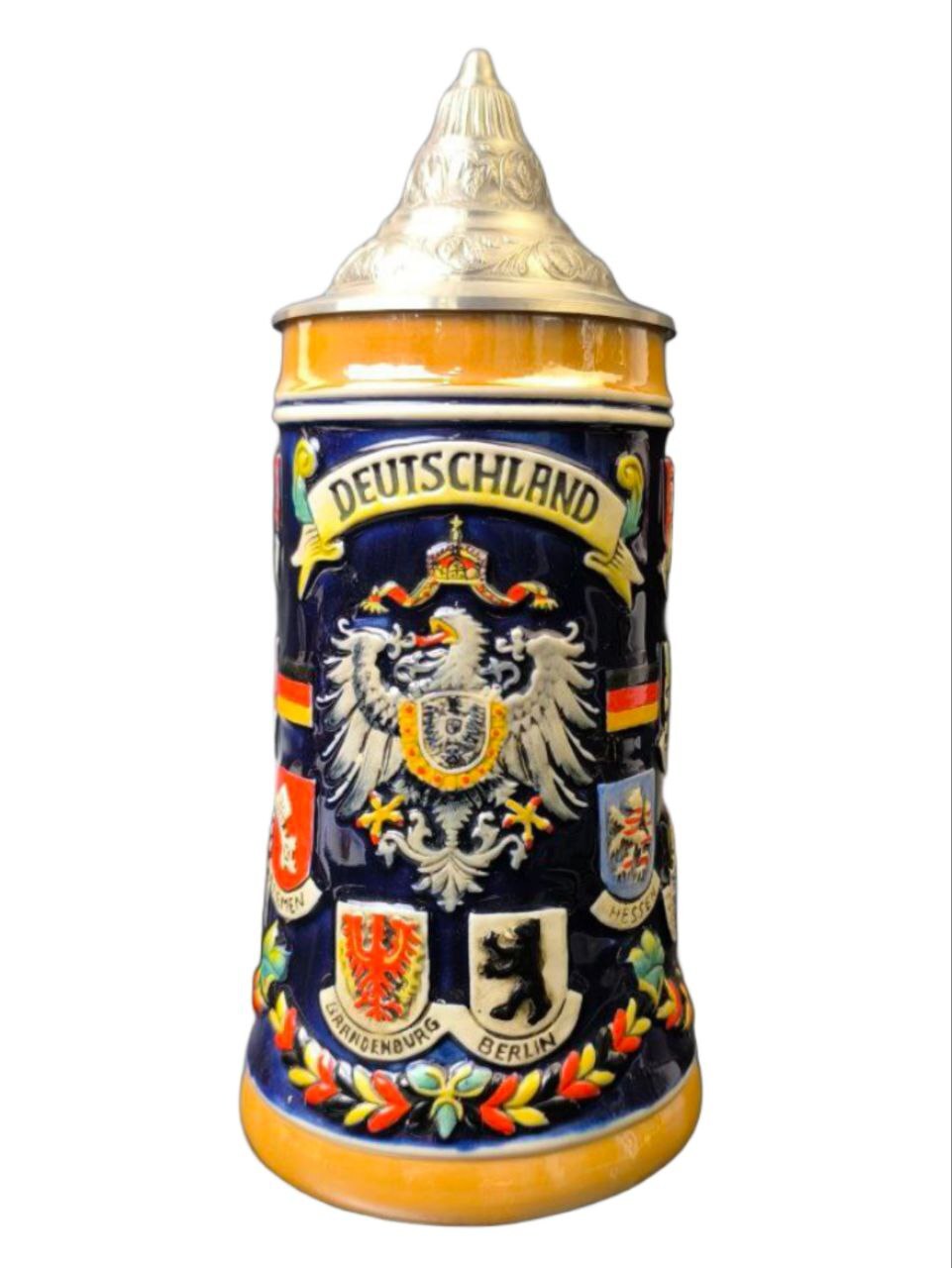 Корпус кружки украшен гербом Германской империи, расположенным в центре, в окружении расписанных вручную щитов, представляющих гербы бывших и нынешних земель Германии, таких как Бавария, Бранденбург, Берлин, Саксония, Баден-Вюртемберг, Гессен, Гамбург и многих других. Каждая деталь тщательно проработана – эмалевые цвета, позолоченные акценты и орнаментальная кайма на дне и крае делают эту кружку не просто утилитарным предметом, а настоящим произведением прикладного искусства.