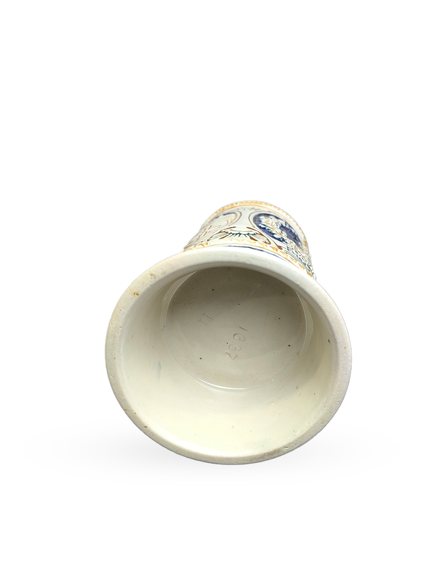 Старинная керамическая кружка для пива. Имеется рельефный мотив по окружности, три сюжета.