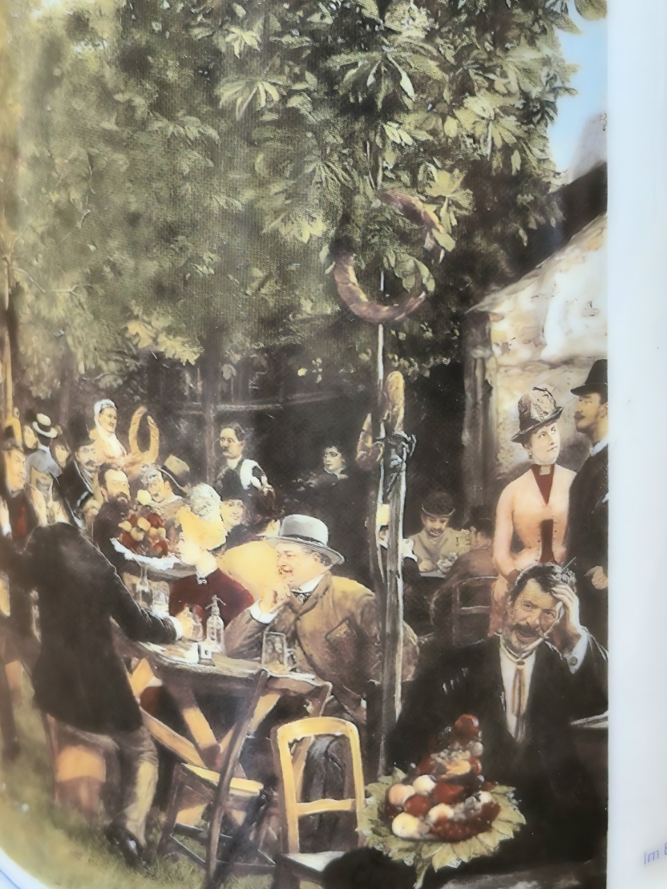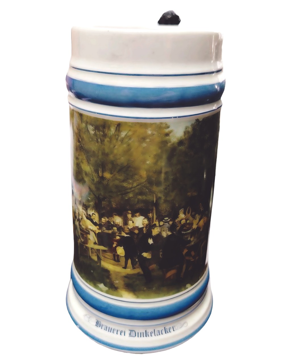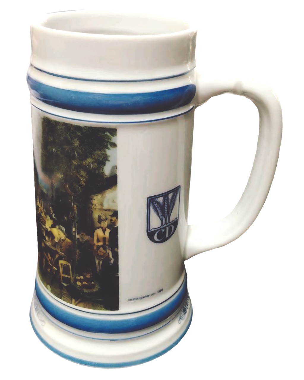 Кружка выполнена в классическом немецком стиле из керамики с синими декоративными полосами сверху и снизу. В центральной части расположена художественная иллюстрация, изображающая сцену отдыха в немецком пивном саду (Biergarten).