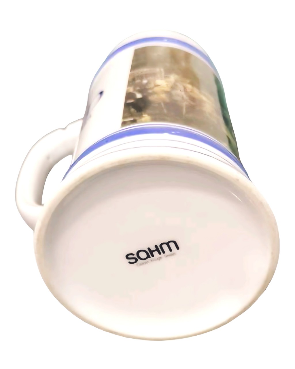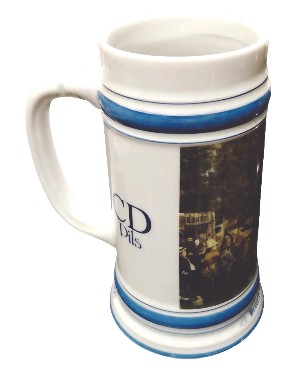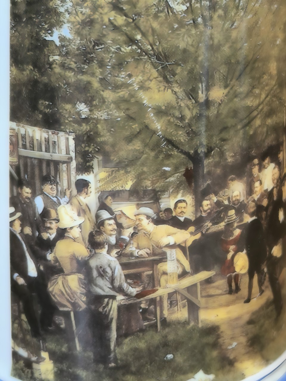 Кружка выполнена в классическом немецком стиле из керамики с синими декоративными полосами сверху и снизу. В центральной части расположена художественная иллюстрация, изображающая сцену отдыха в немецком пивном саду (Biergarten).