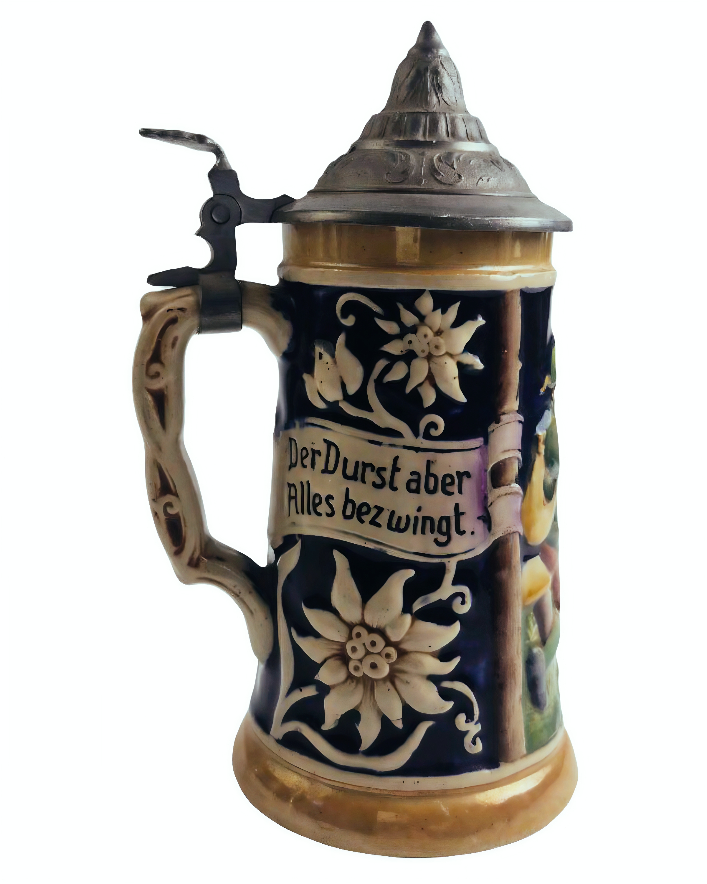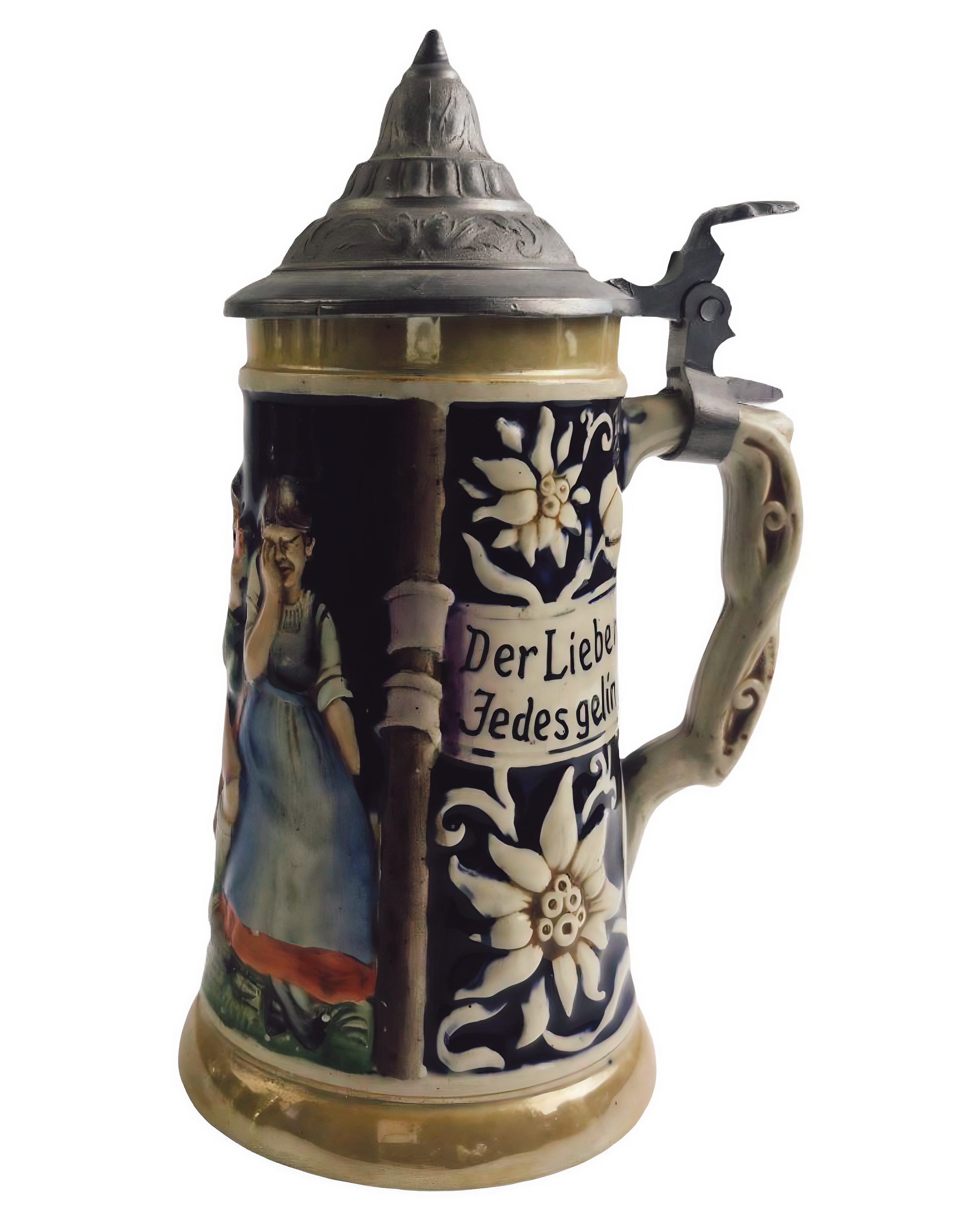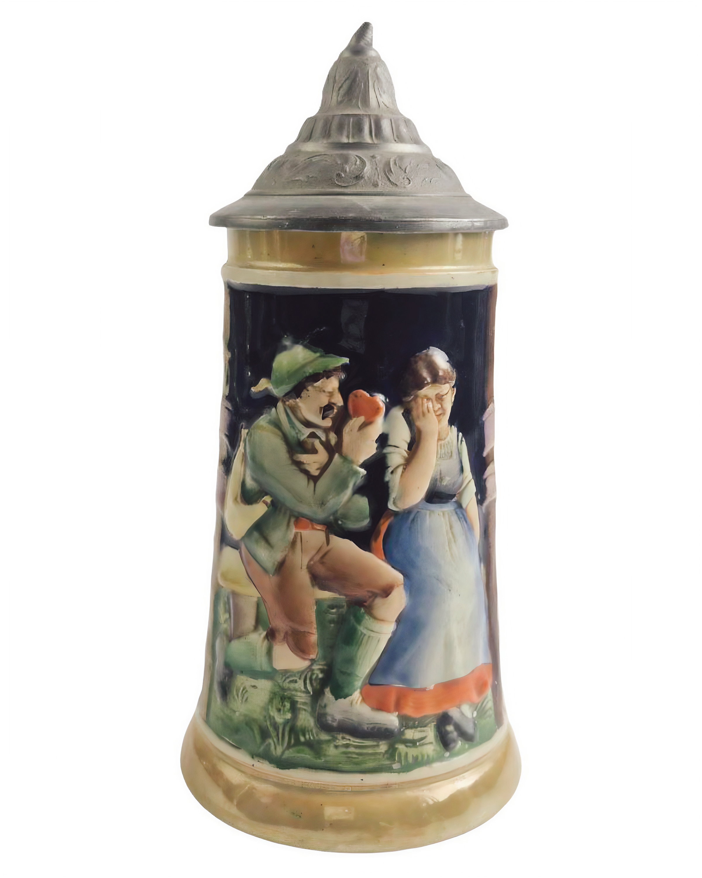 На тулове кружки изображена цветная рельефная сцена, которую часто описывают как «сцену флирта» или «ухаживания» в народном стиле.
