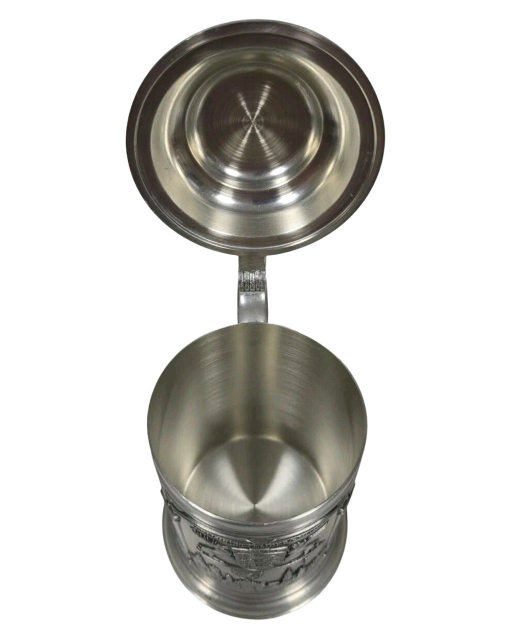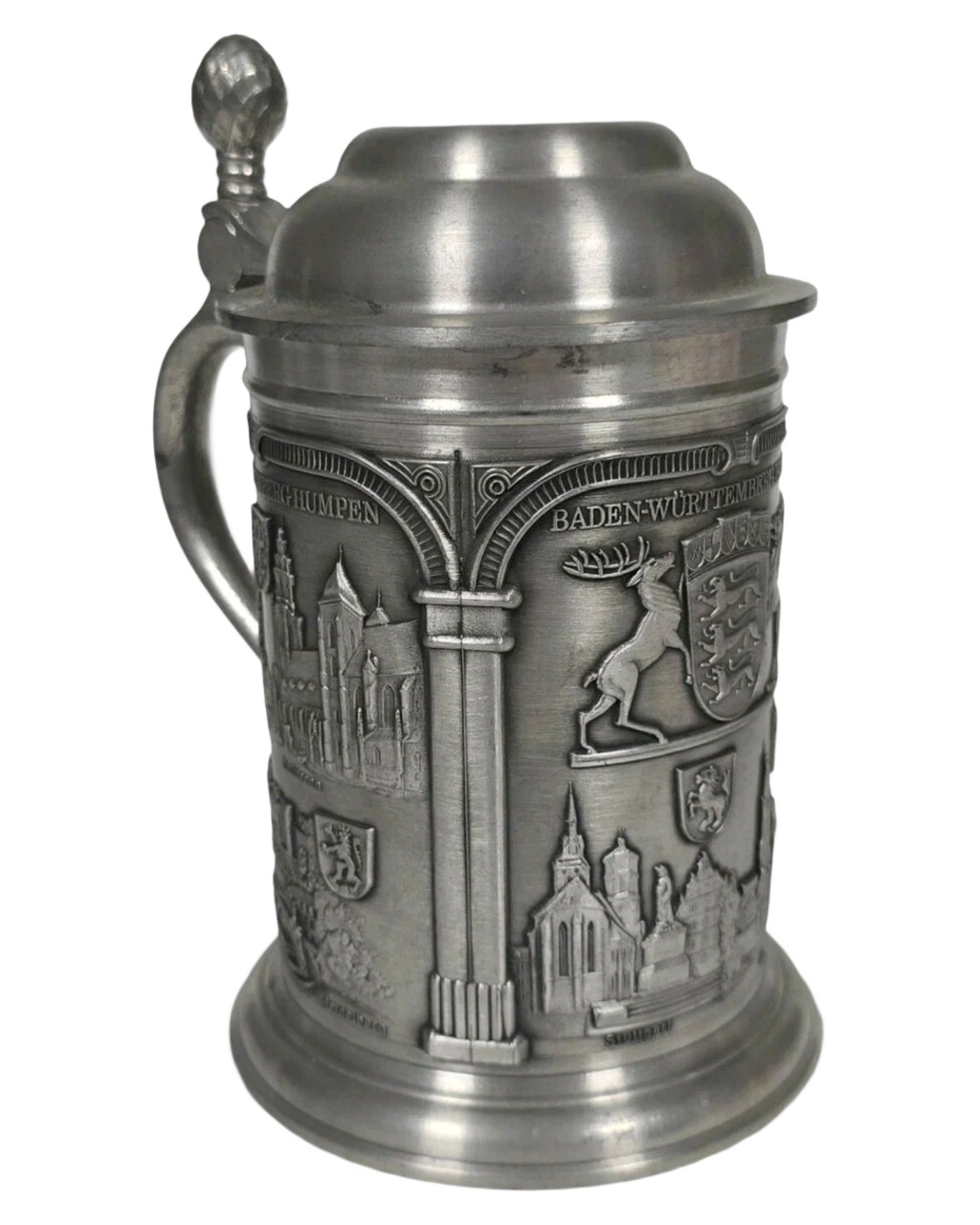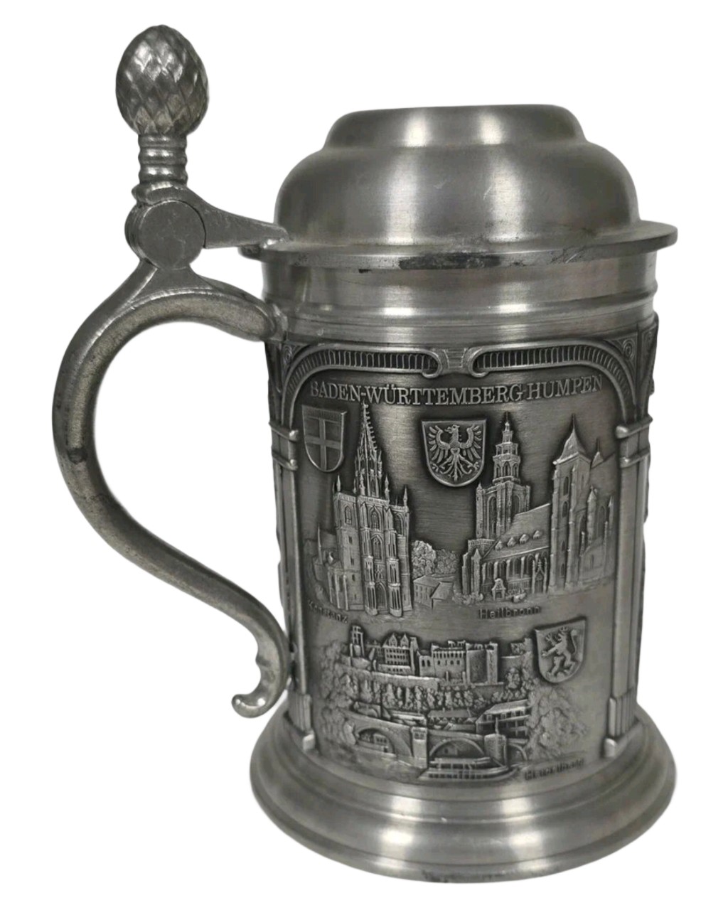 Кружка украшена художественными барельефами, включающими герб земли Баден-Вюртемберг и городские пейзажи.