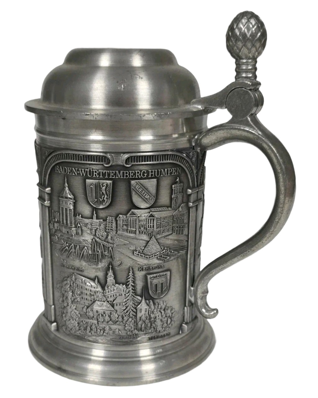 Центральная надпись гласит «Baden-Württemberg Humpen». В нижней части видны названия городов региона: Мангейм (Mannheim) и Карлсруэ (Karlsruhe).