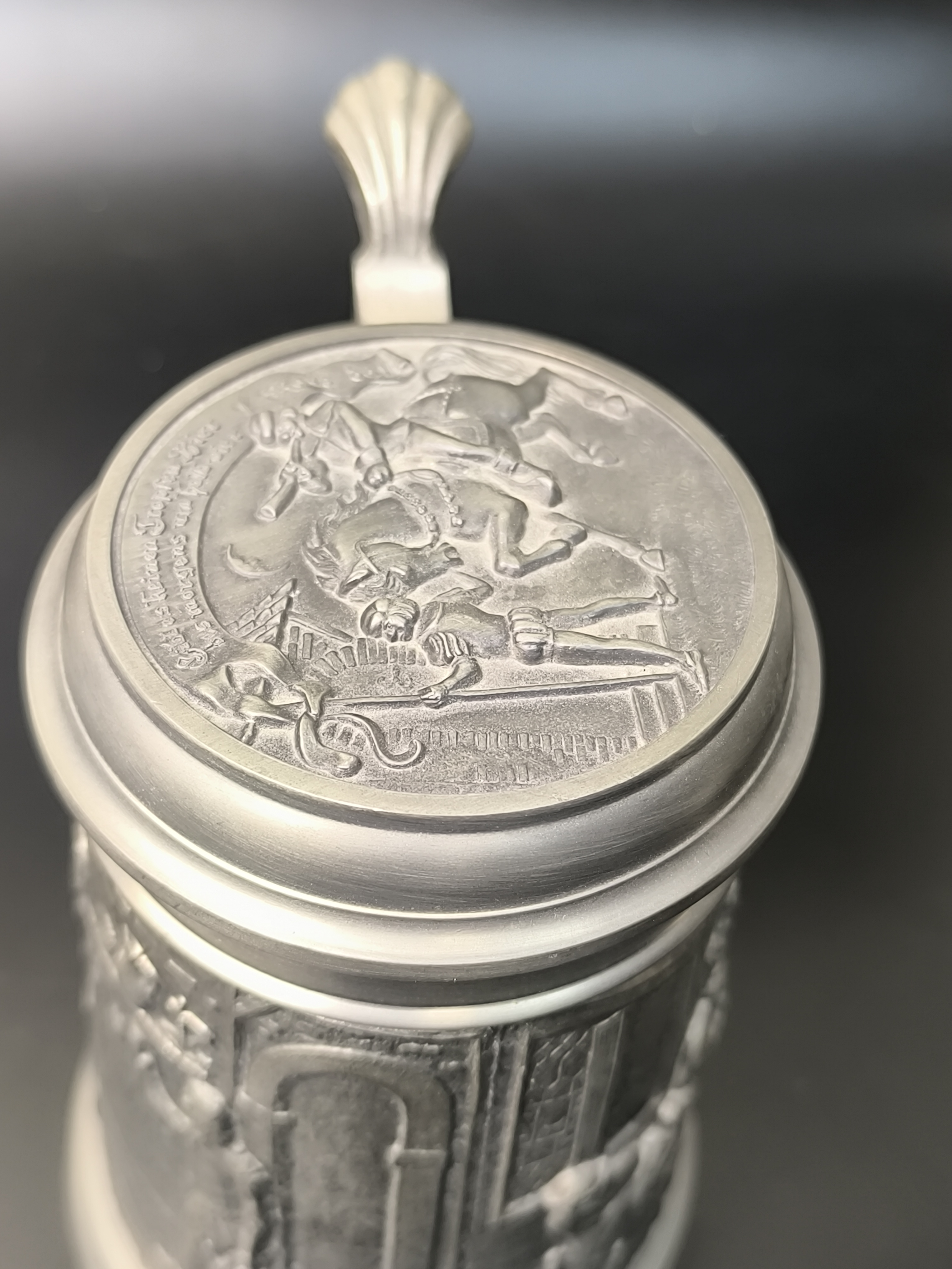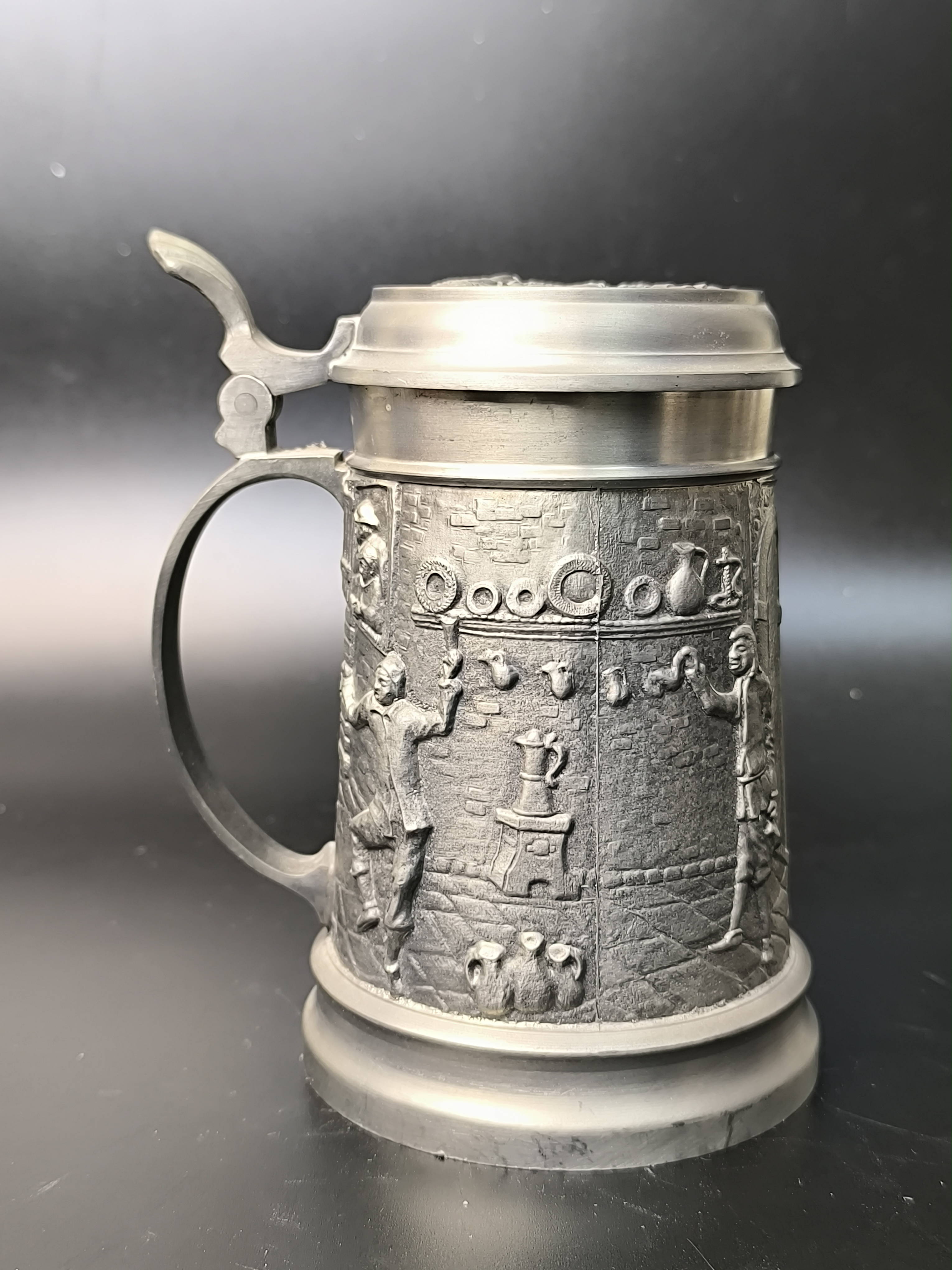 Оригинальной формы, красивый рельеф. Именно немцы придумали оловянные кружки с крышками, которые поднимаются при нажатии на специальный рычажок. Это позволит создать пышную шапку пены и почувствовать тонкий аромат, не теряя ни одной его ноты. Благодаря крышке, пиво не будет терять резкости и выдыхаться. Можно не торопиться, а спокойно, не торопясь наслаждаться беседой и пенным напитком.