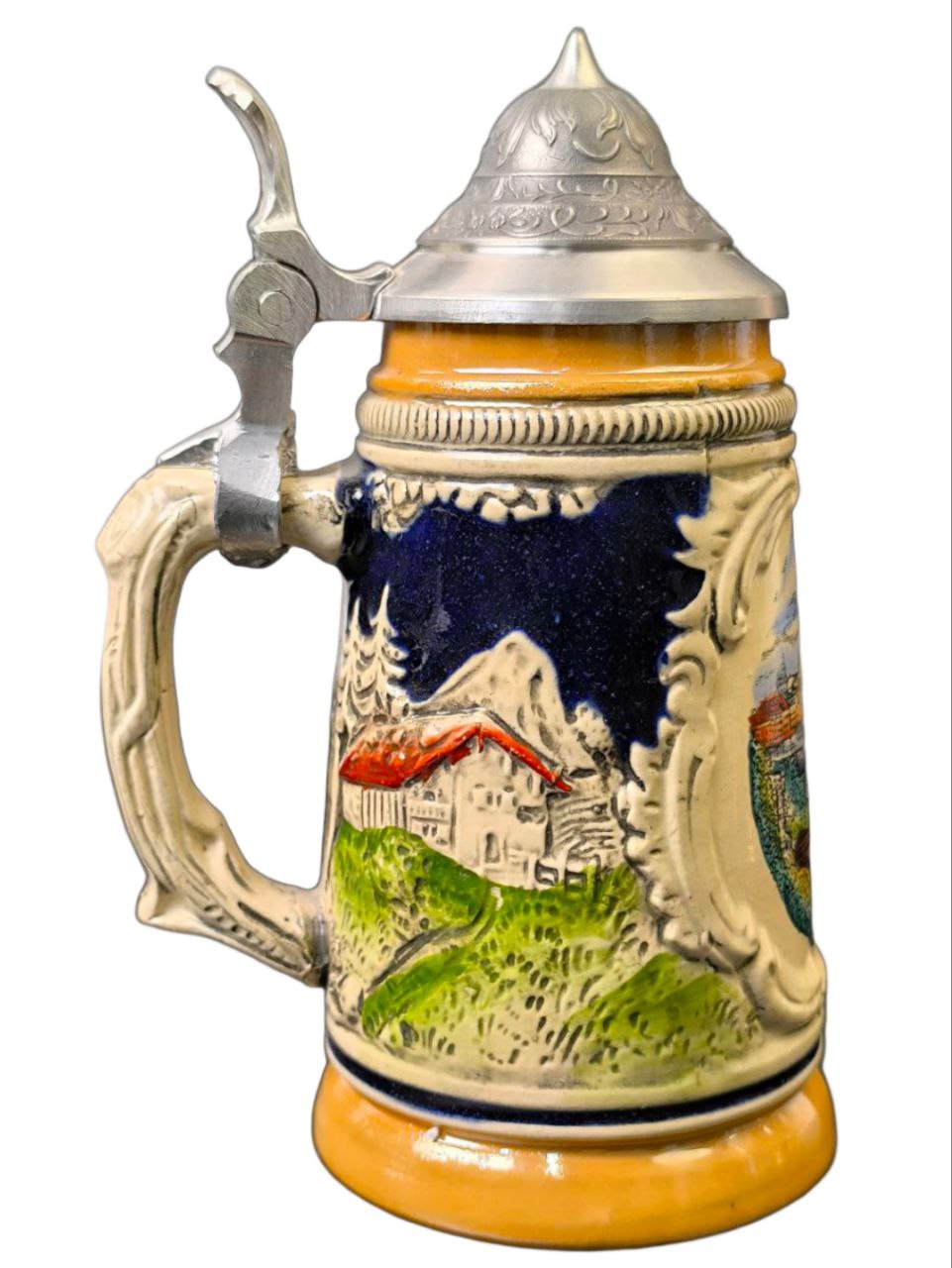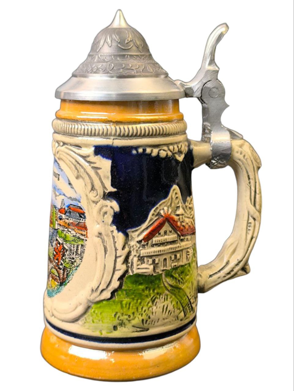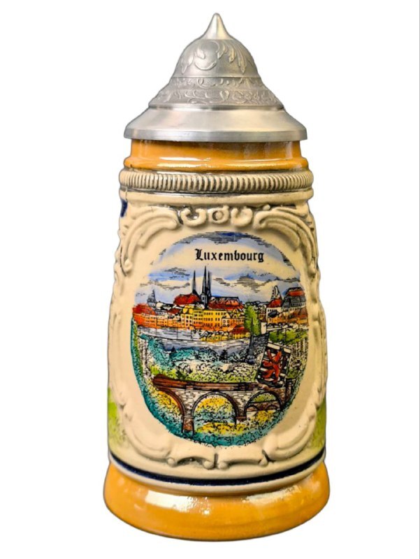 Это керамическая пивная кружка в немецком стиле (штайн) с оловянной крышкой, посвященная Люксембургу. На ней изображен живописный вид на город, включая реку и мост, а также надпись "Luxembourg".