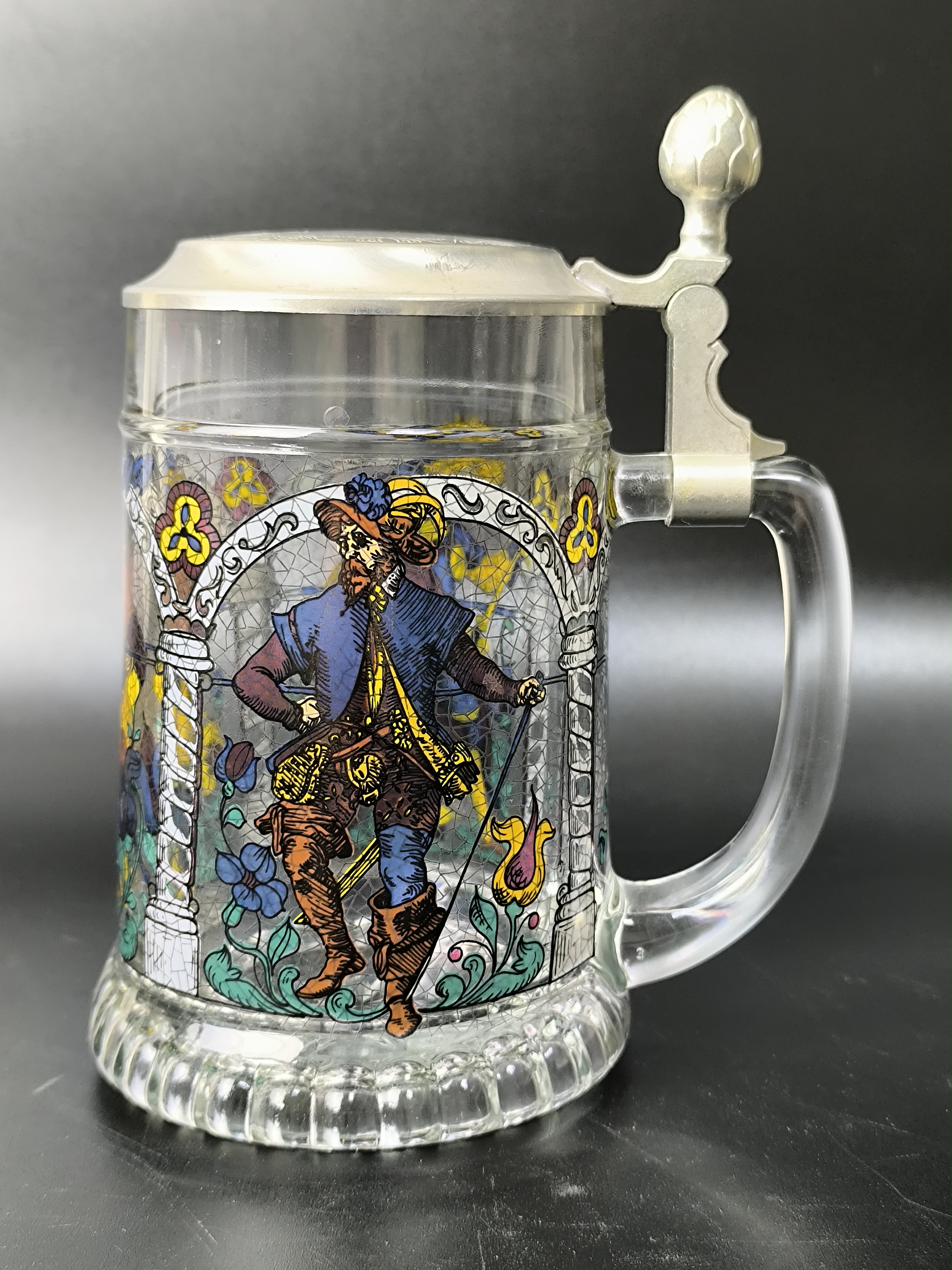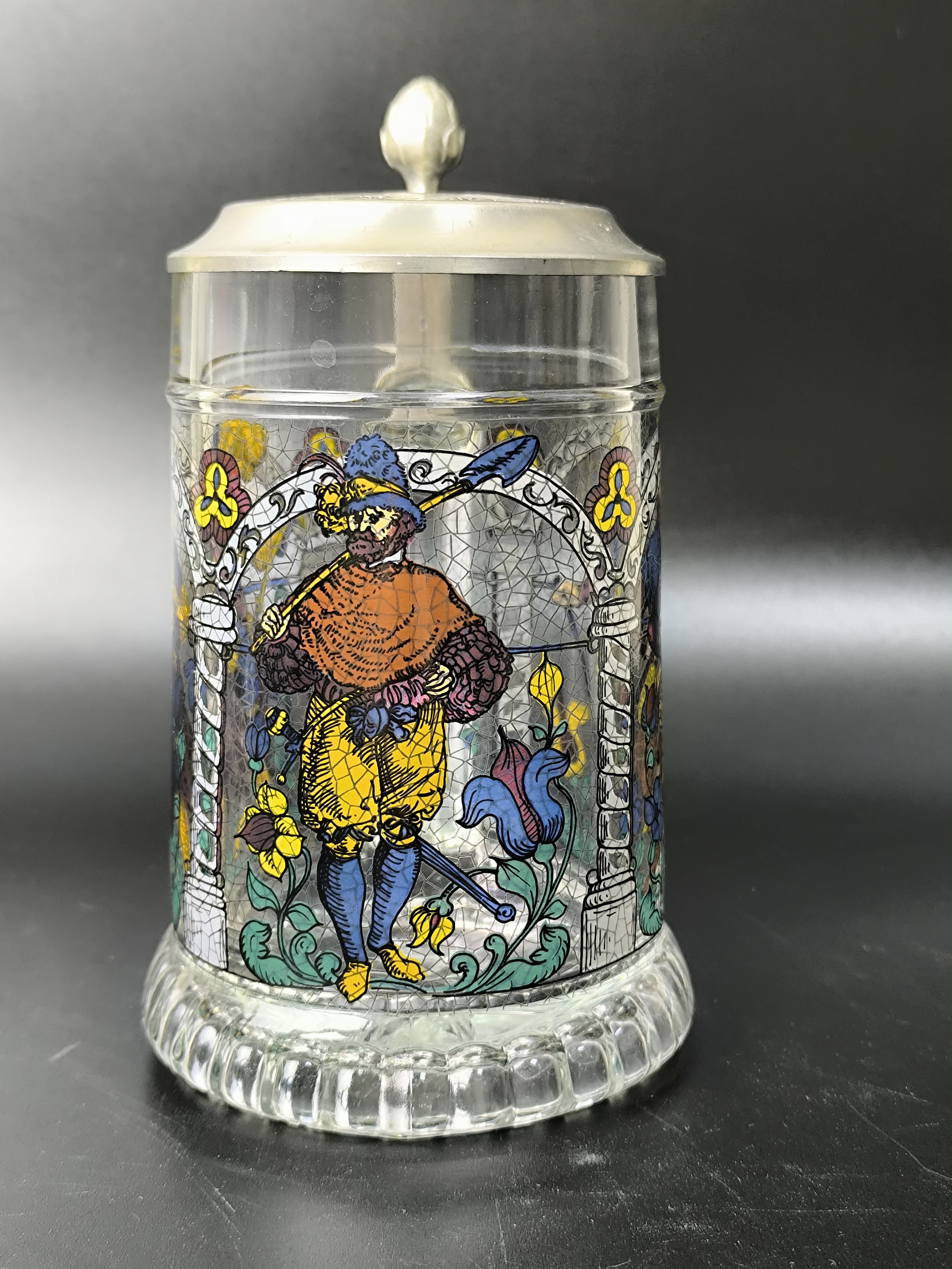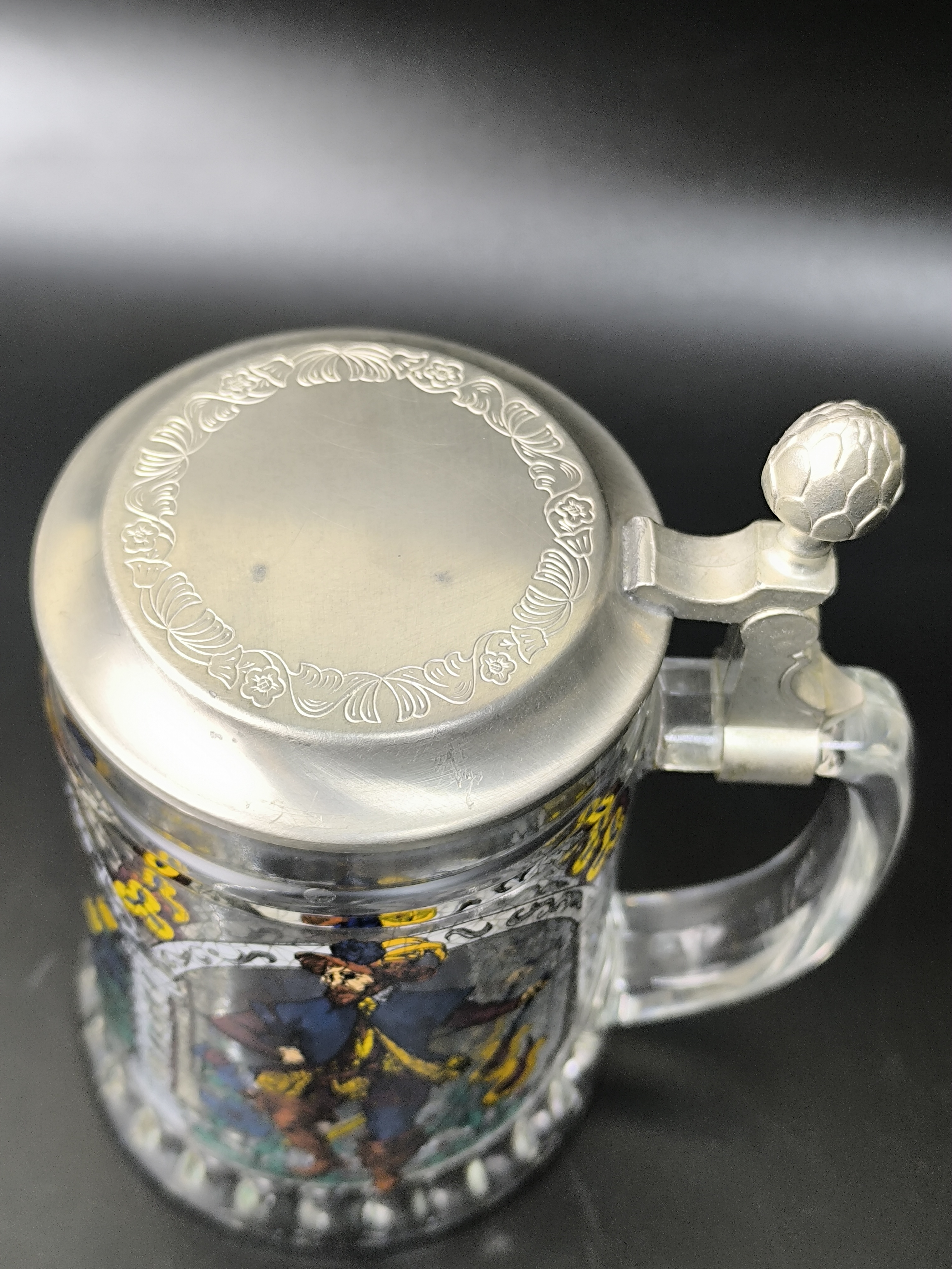 Классическая немецкая пивная кружка из стекла с оловянной крышкой, с несколькими сюжетами.