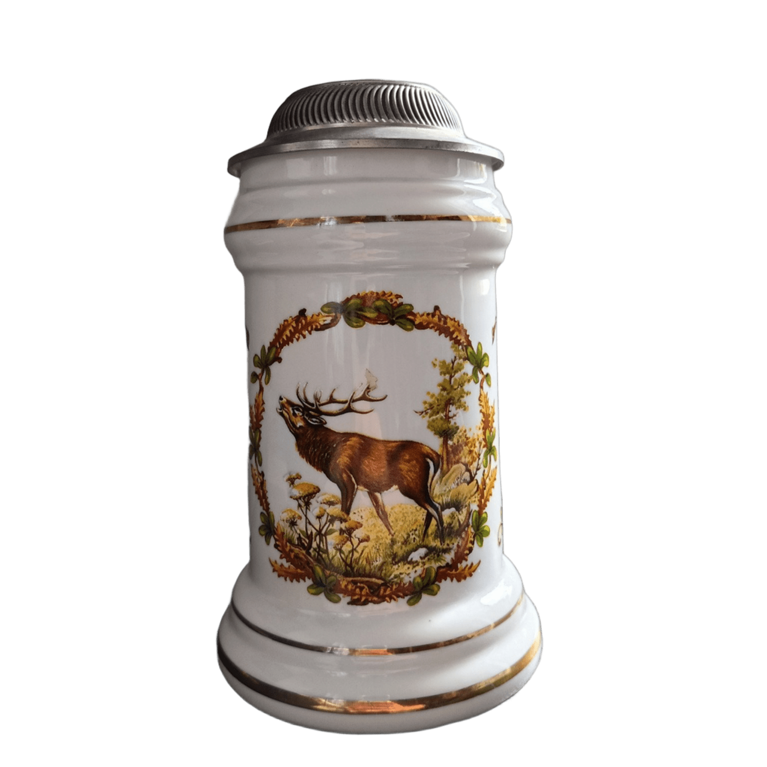 Старинная керамическая кружка для пива с крышкой с изображен олень на прогулке. .