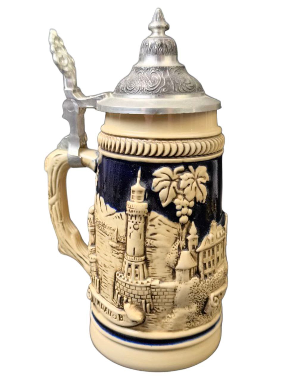 Кружка изготовлена из фарфора, украшена декором и оловянной крышкой.