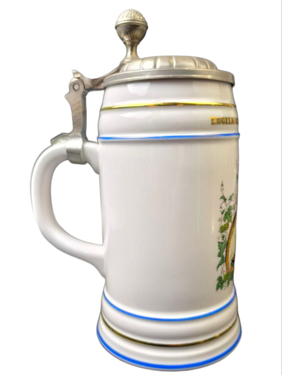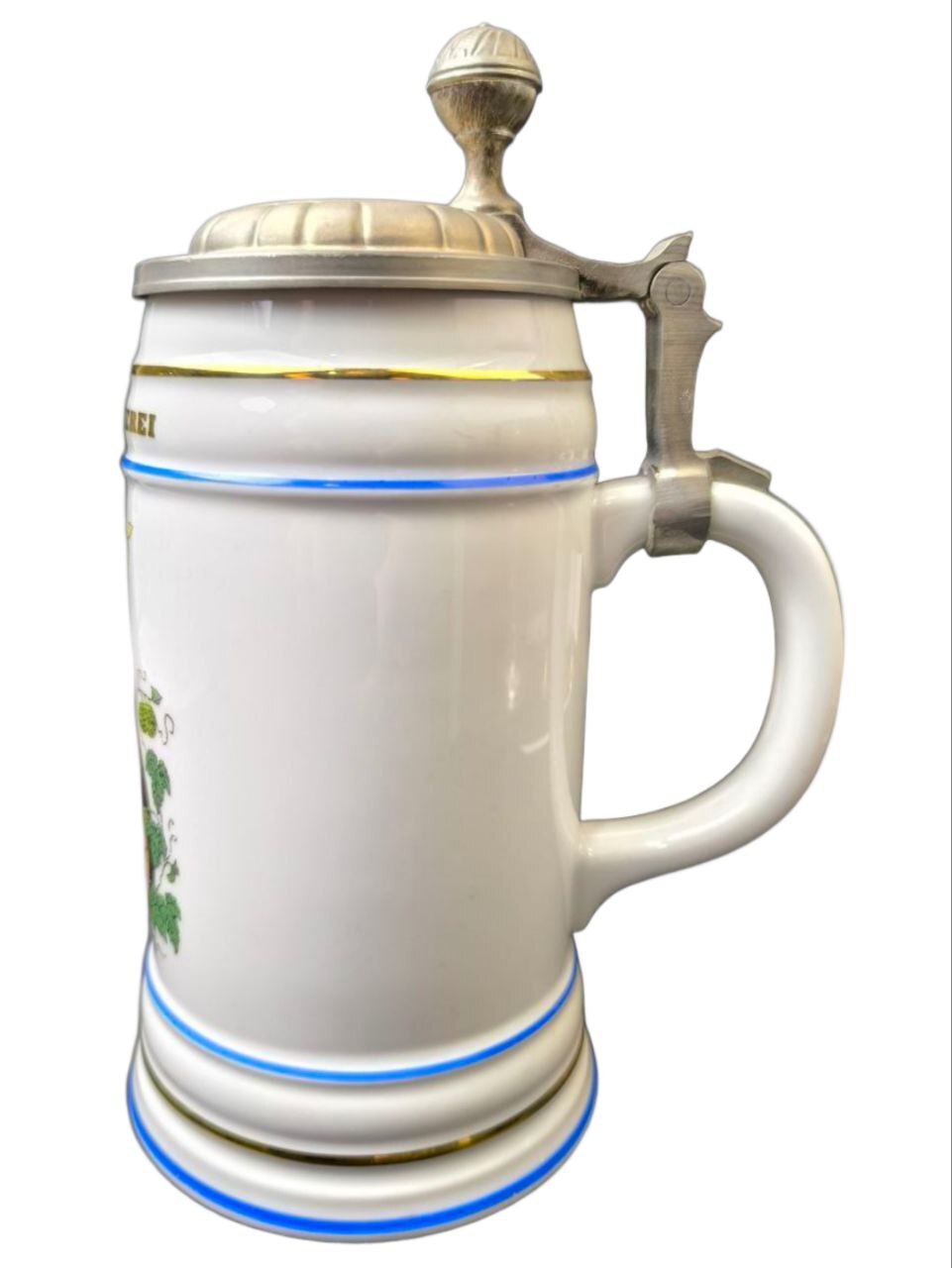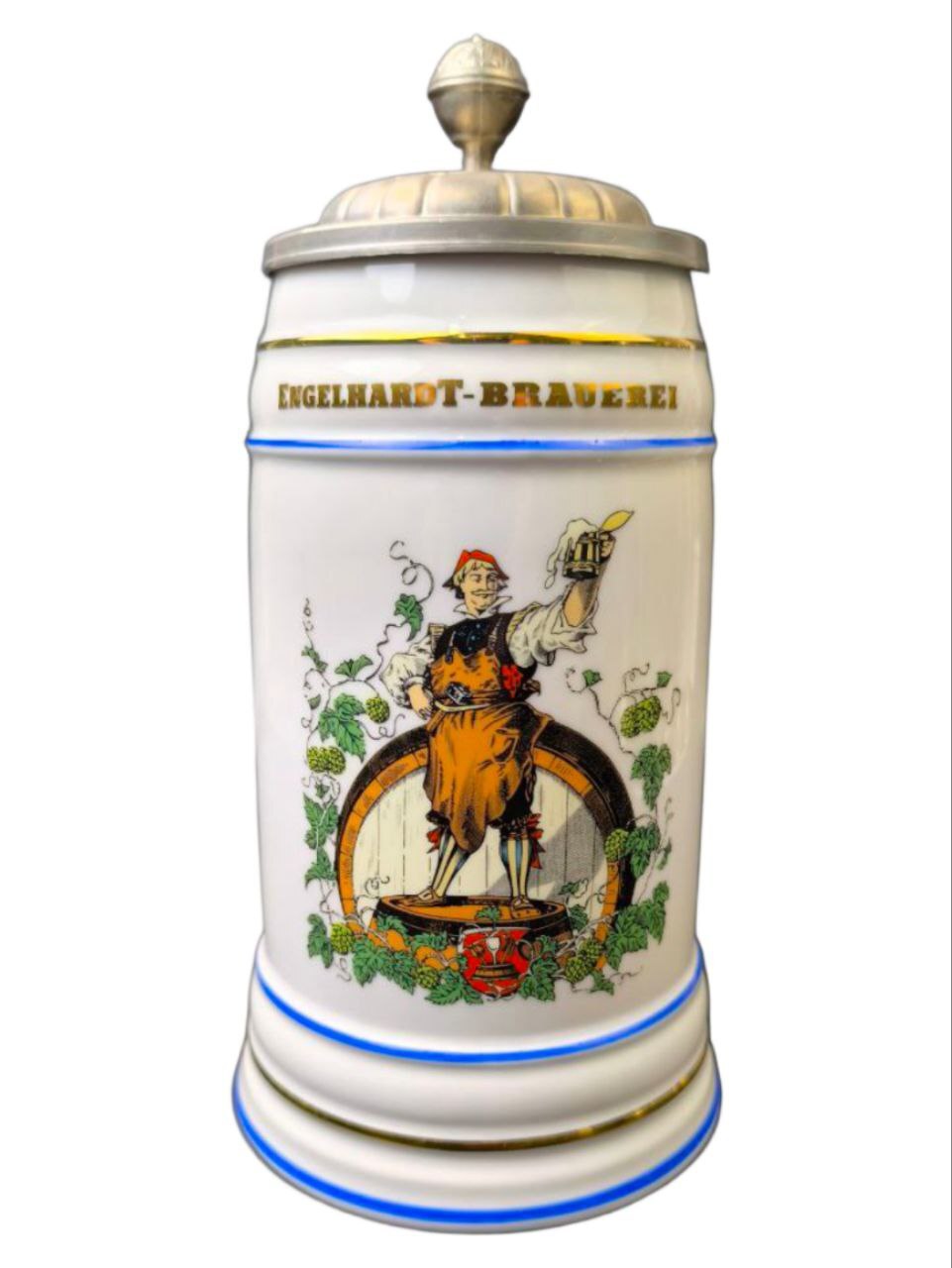 Кружка изготовлена из фарфора, украшена декором и оловянной крышкой. Надпись "ENGELHARDT-BRAUEREI" относится к исторической берлинской пивоварне Engelhardt, которая была преобразована в комплекс офисов и ателье.