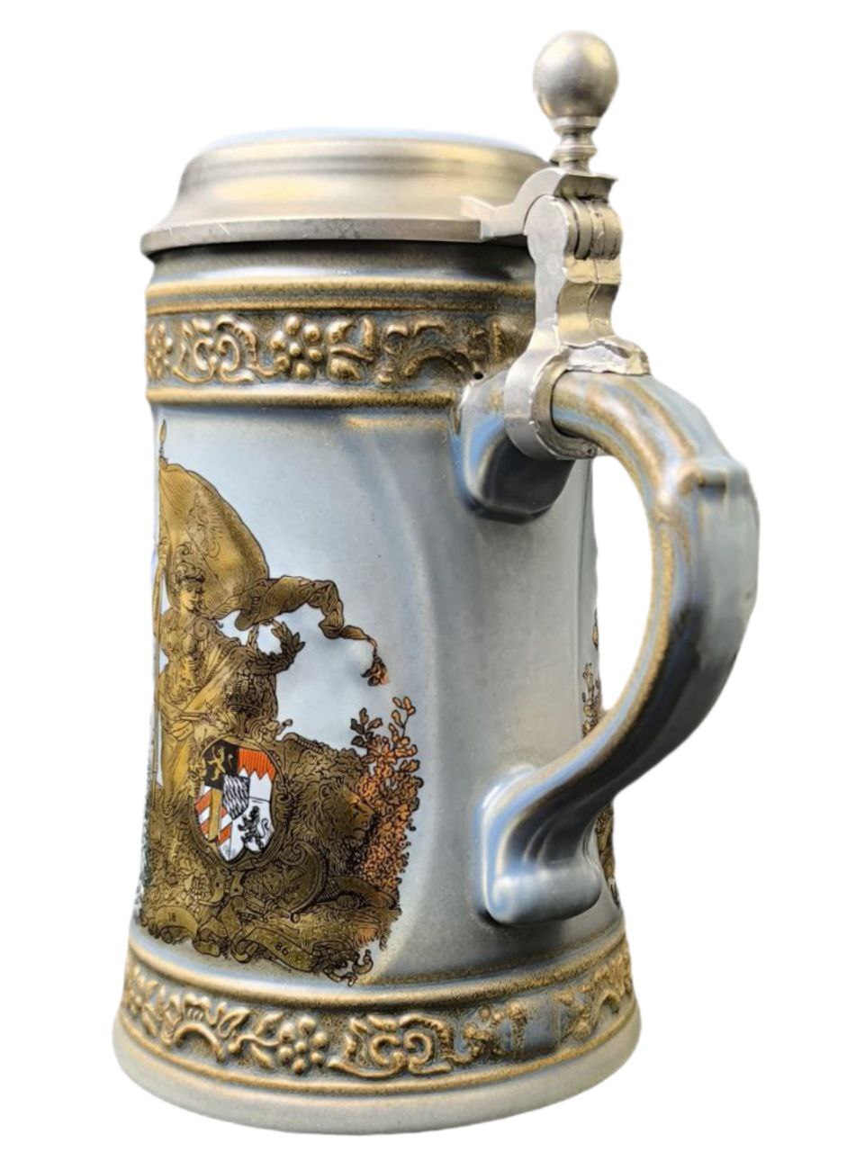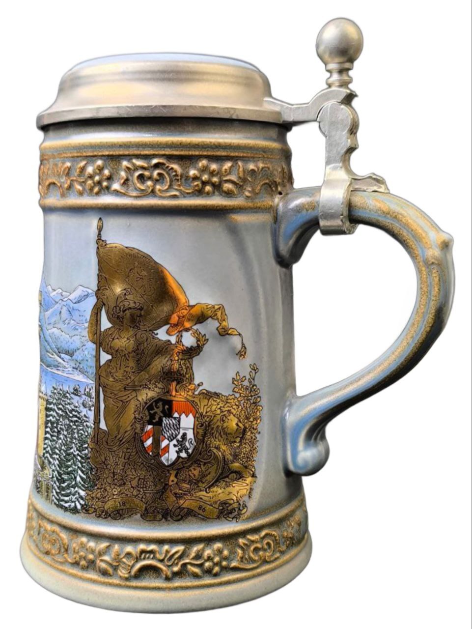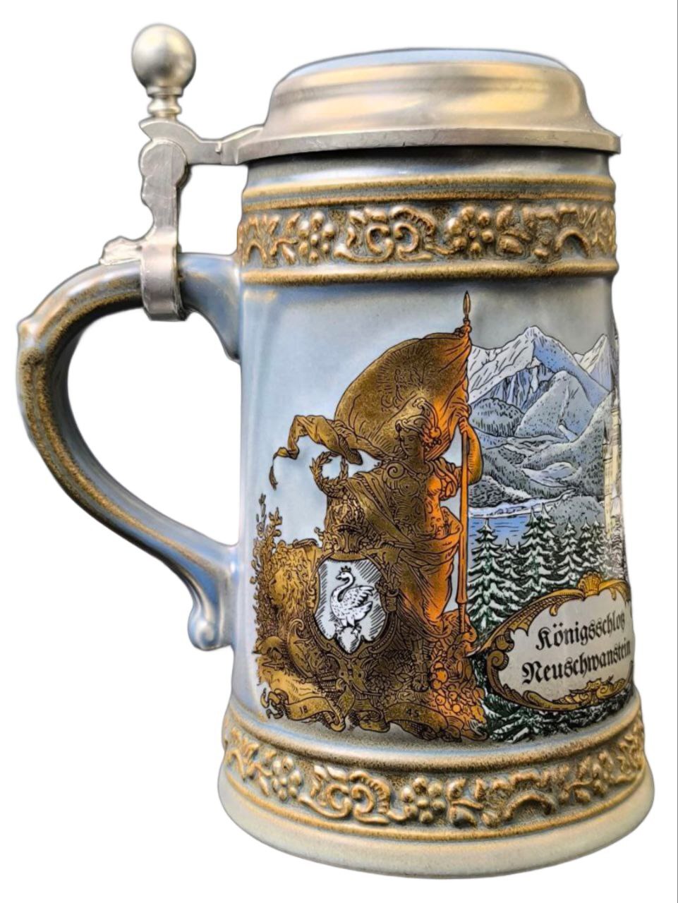 Кружка изготовлена из фарфора, украшена декором и оловянной крышкой. Кружка выполнена в технике рельефа и украшена детализированным, раскрашенным вручную изображением замка Нойшванштайн, расположенного среди заснеженных альпийских гор.