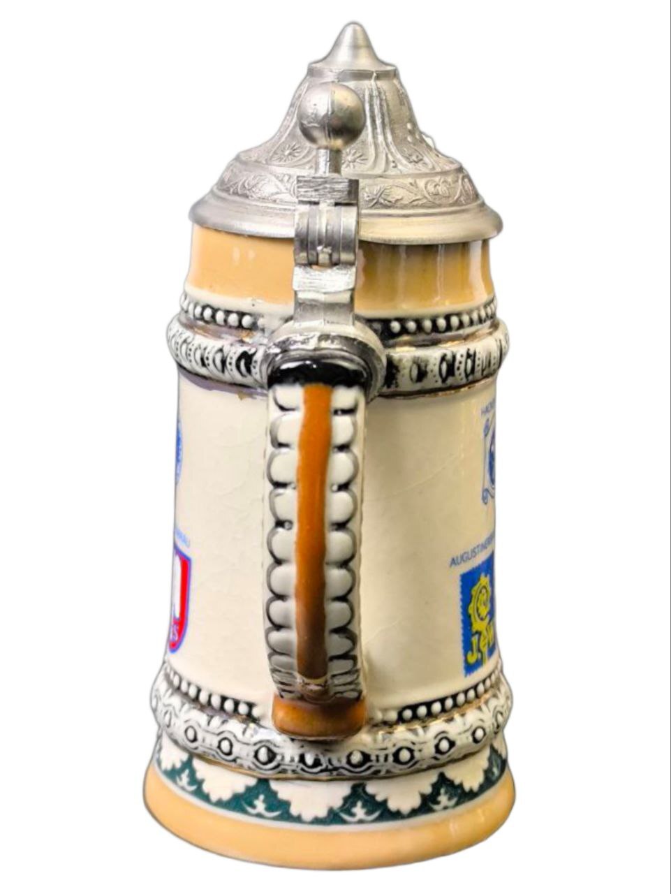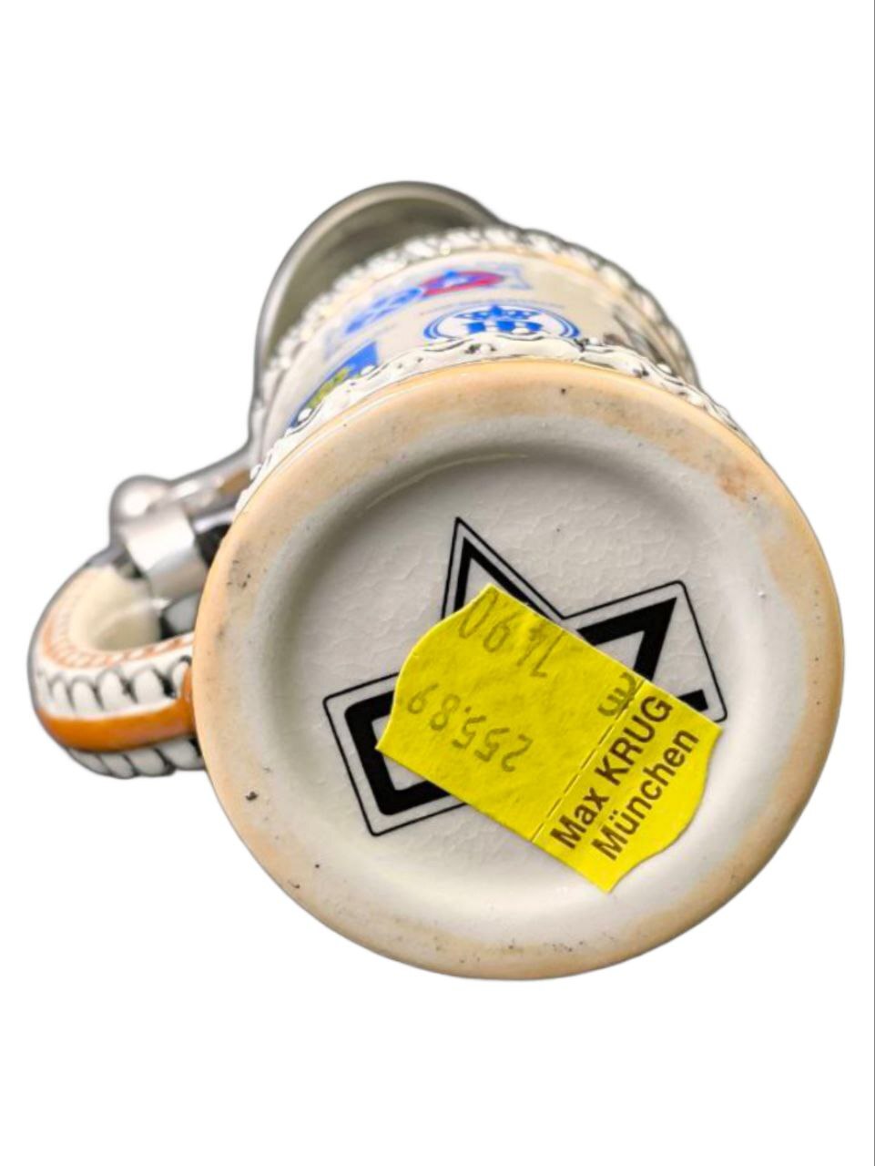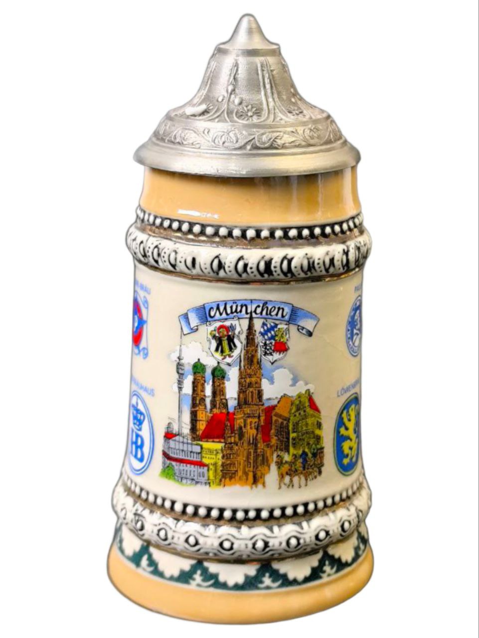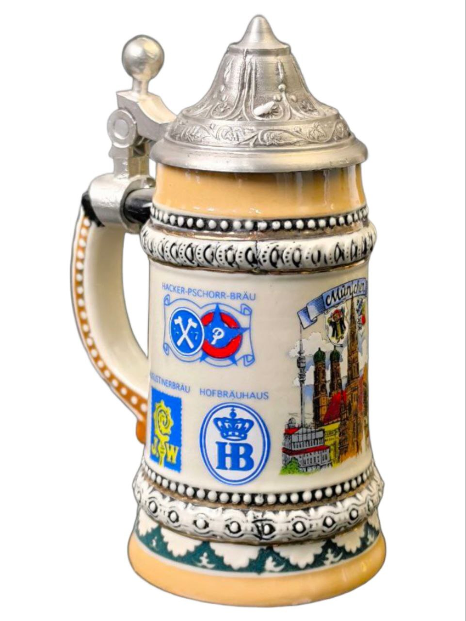 Кружка изготовлена из фарфора, украшена декором и оловянной крышкой. Кружка украшена рельефными и раскрашенными изображениями достопримечательностей Мюнхена, включая собор Фрауэнкирхе (Frauenkirche). На ней также видны гербы известных мюнхенских пивоварен, таких как Hofbräuhaus (символ HB) и Löwenbräu (символ льва). Надпись "München" (Мюнхен) выполнена на синей ленте.