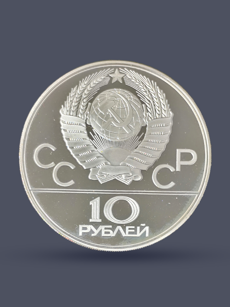 Подлинная серебряная монета России достоинством 10 рублей СССР 1977 год.
