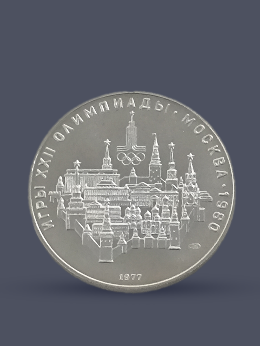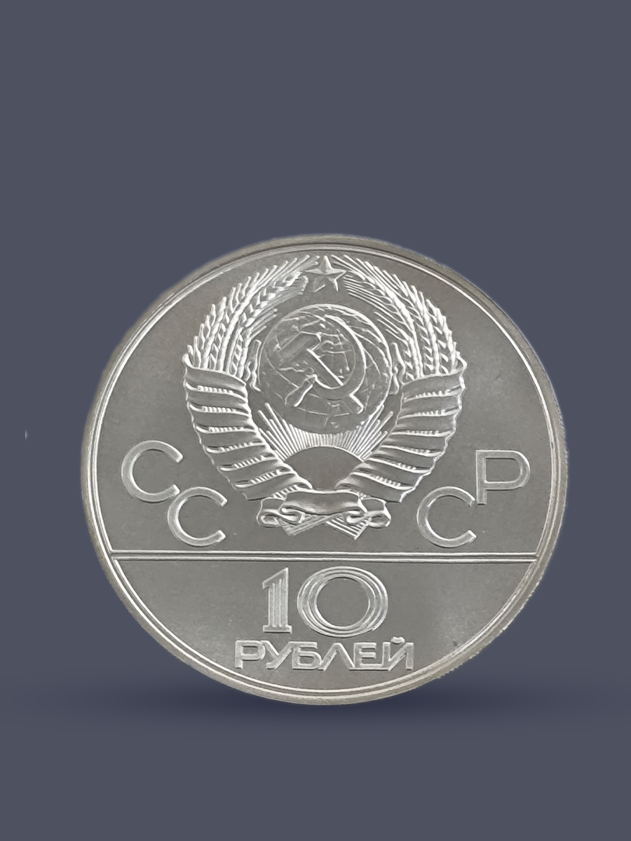 Подлинная серебряная монета России достоинством 10 рублей СССР 1977 года.