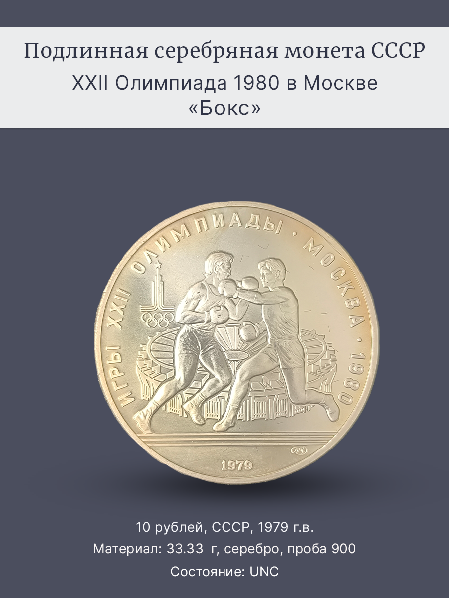 Подлинная серебряная монета России достоинством 10 рублей СССР 1979 года.