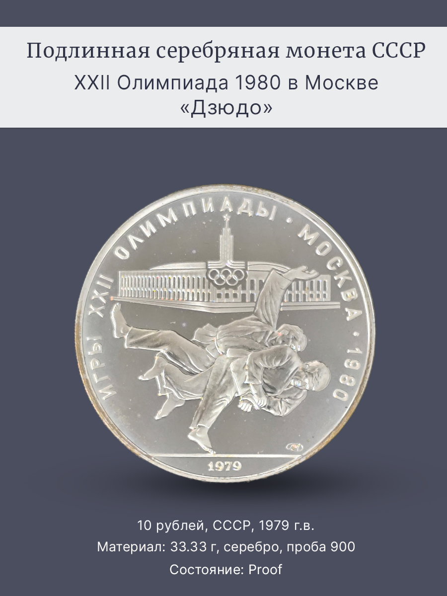 Подлинная серебряная монета России достоинством 10 рублей СССР 1979 года.