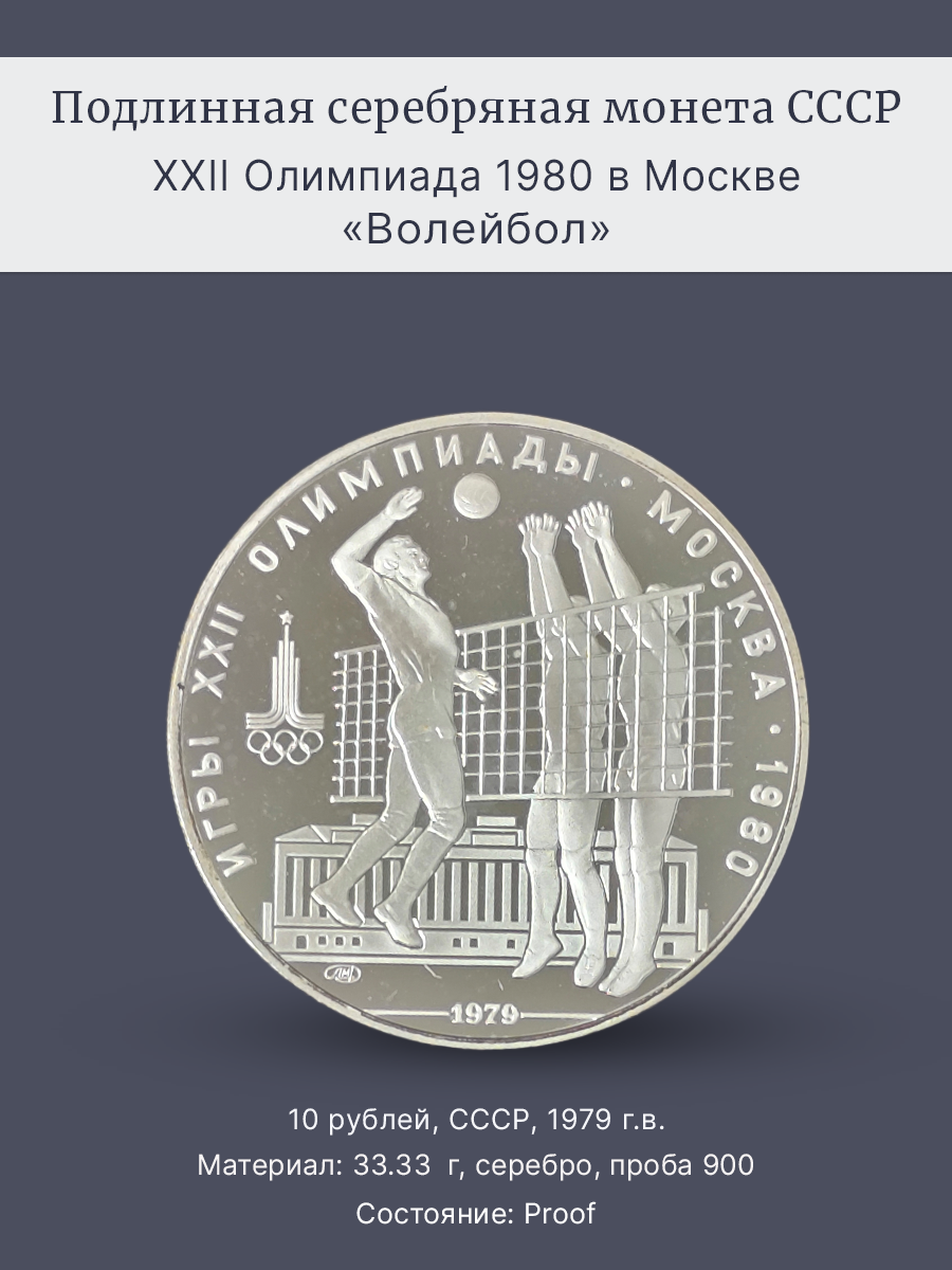 Подлинная серебряная монета России достоинством 10 рублей СССР 1979 года.