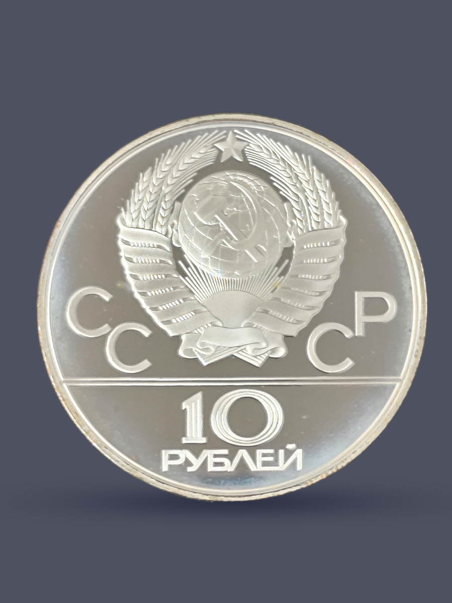 Подлинная серебряная монета России достоинством 10 рублей СССР 1980 года.