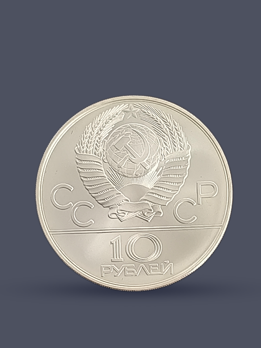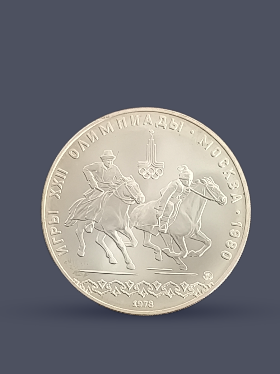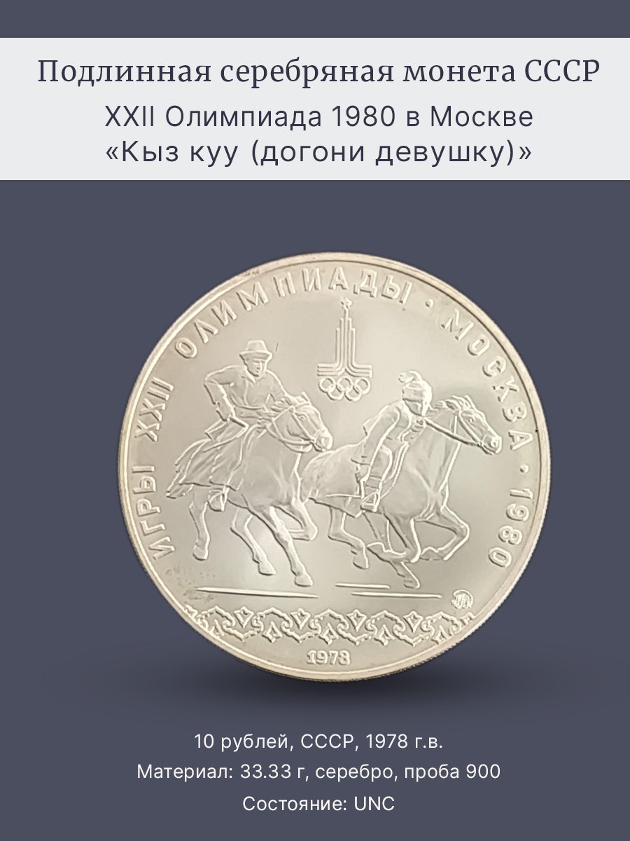 Подлинная серебряная монета России достоинством 10 рублей СССР 1978 Название: "XXII Олимпиада 1980 в Москве - кыз куу (догони девушку)".