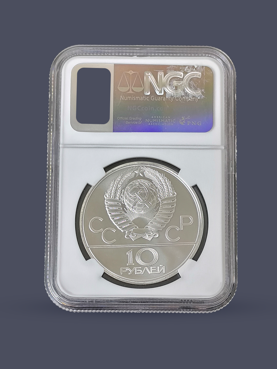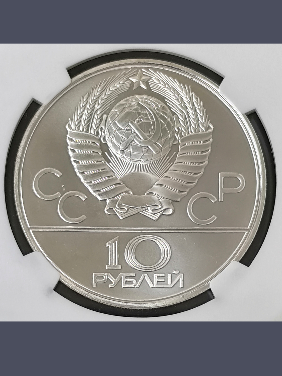 Подлинная серебряная монета России достоинством 10 рублей СССР 1980 года.