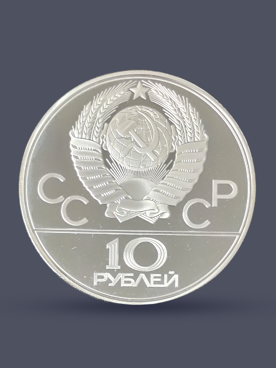 Подлинная серебряная монета России достоинством 10 рублей СССР 1978 года.