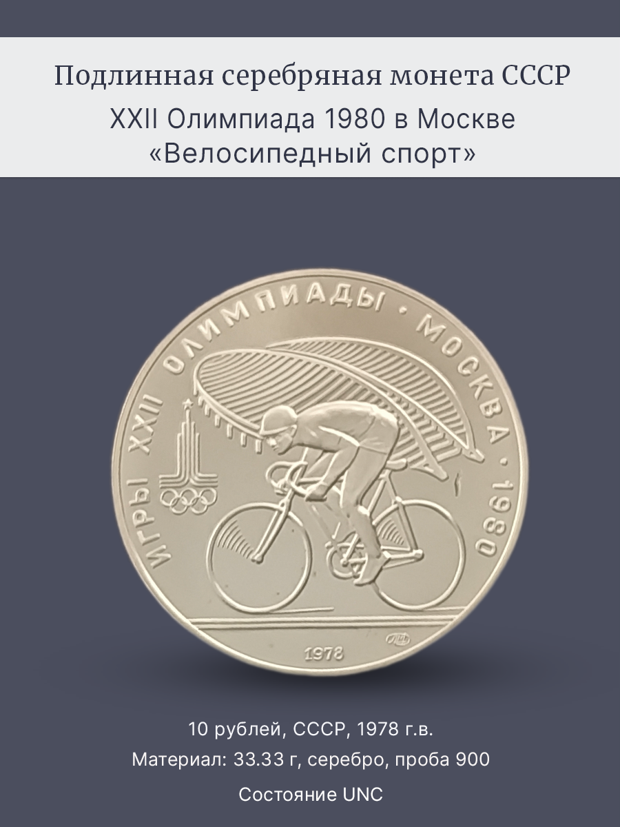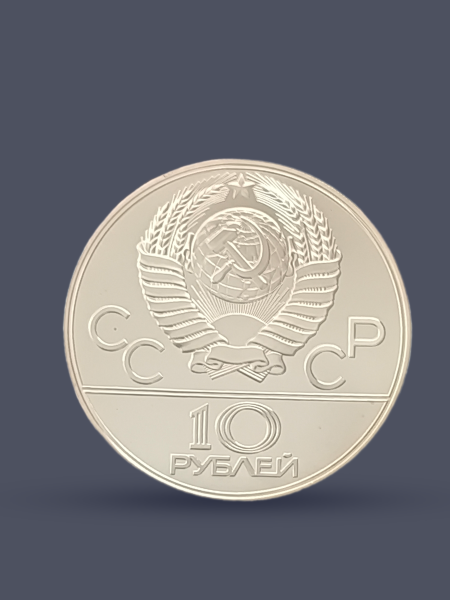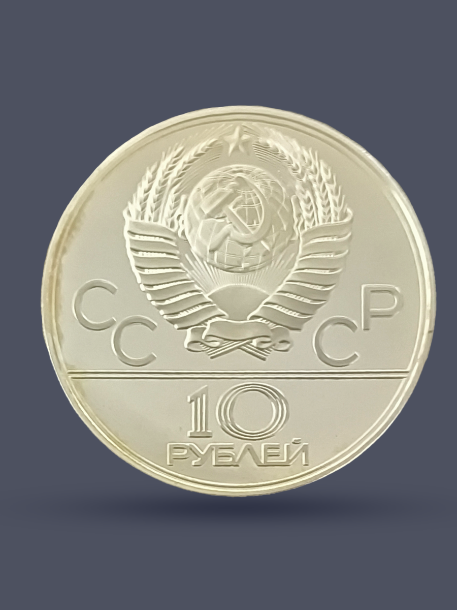 Подлинная серебряная монета России достоинством 10 рублей СССР 1978 года.