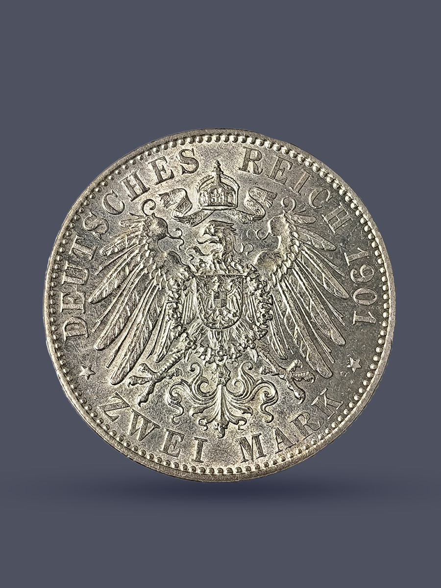 Подлинная серебряная монета Германской Империи достоинством 2 марки 1901 года.