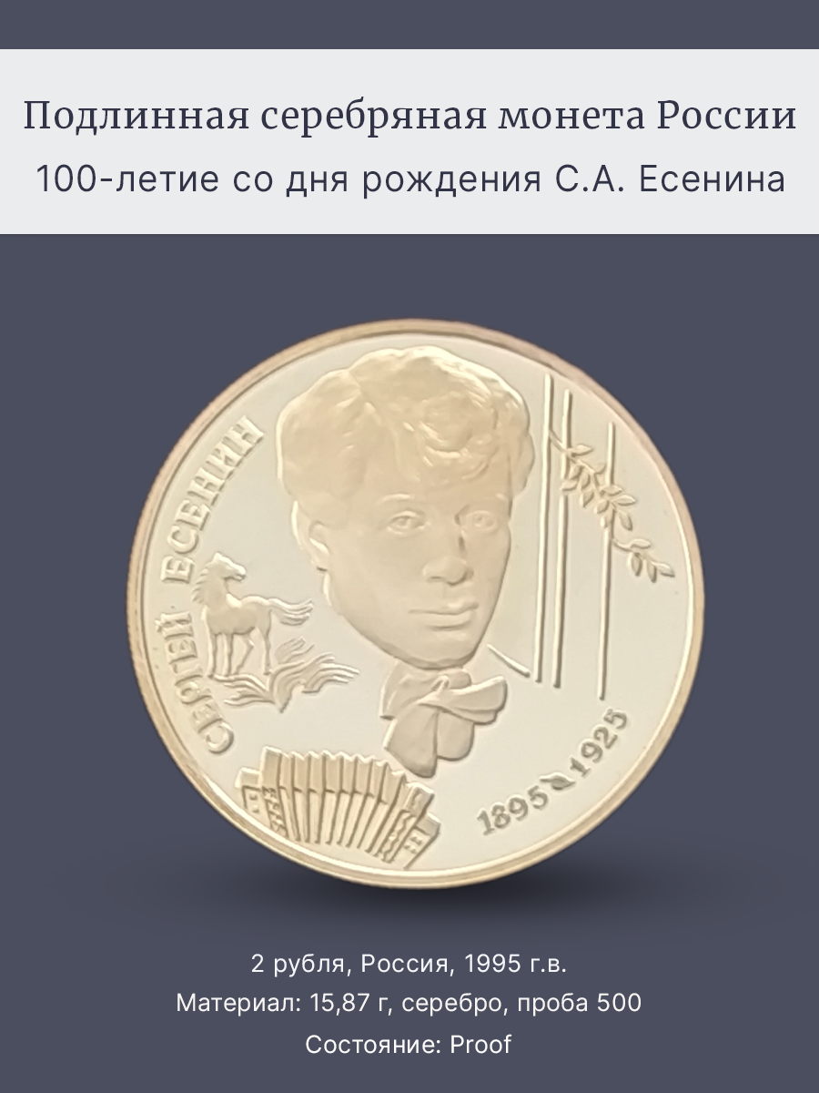 Подлинная серебряная монета России достоинством 2 рубля 1995 год.