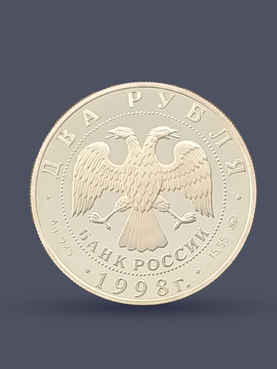 Подлинная серебряная монета России достоинством 2 рубля 1998 года.