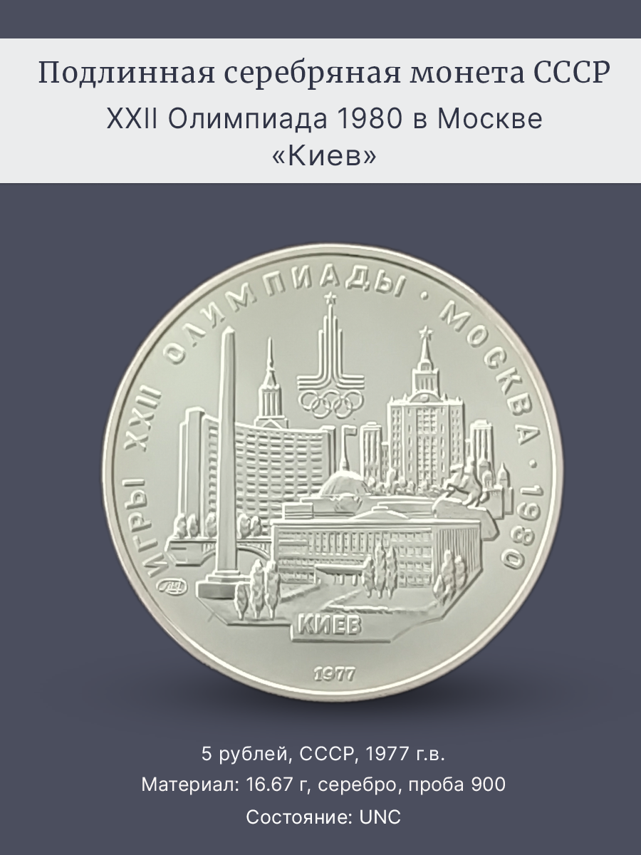 Подлинная серебряная монета России достоинством 5 рублей СССР 1977 год.