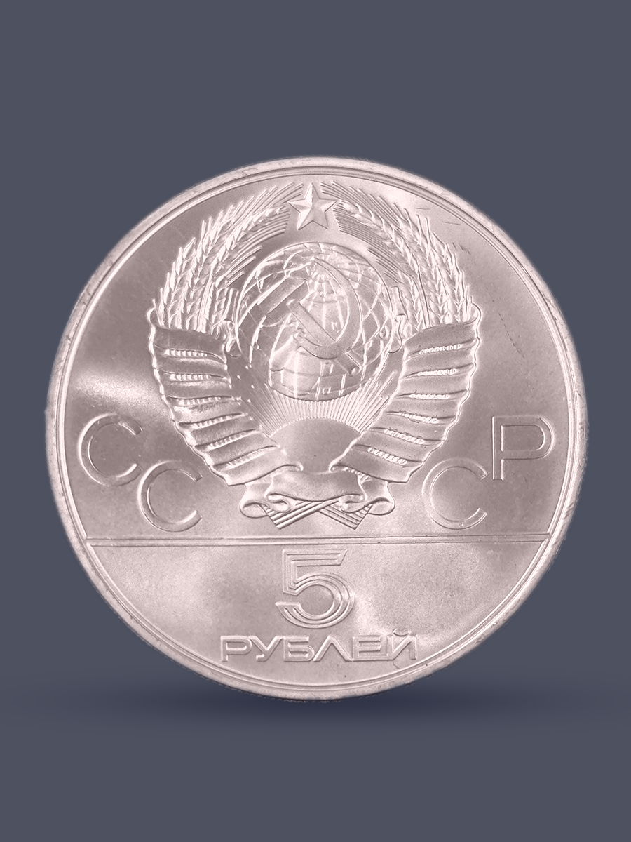 Подлинная серебряная монета России достоинством 5 рублей СССР 1980 год.