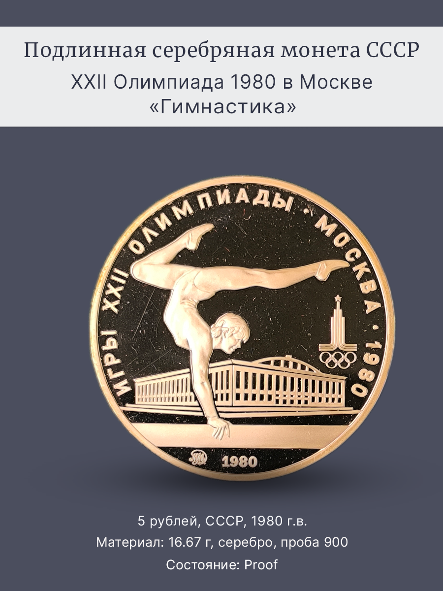 Подлинная серебряная монета России достоинством 5 рублей СССР 1980 год.