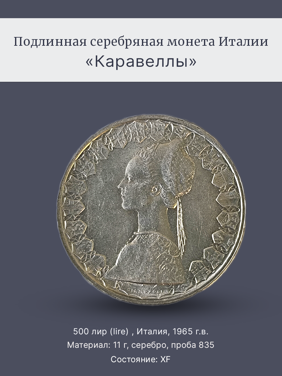 Подлинная серебряная монета Италии достоинством 500 лир (lire) 1965 год.