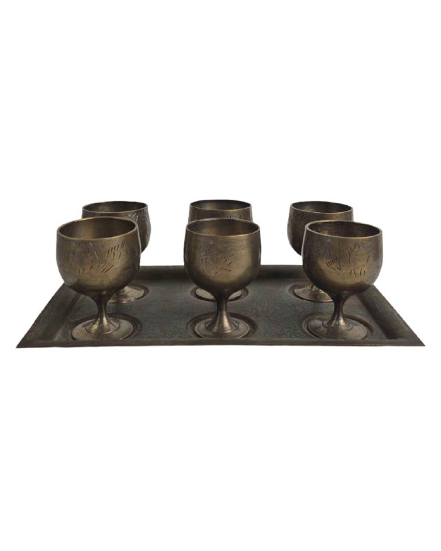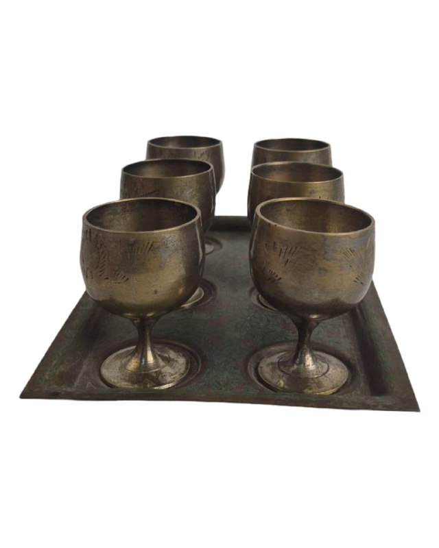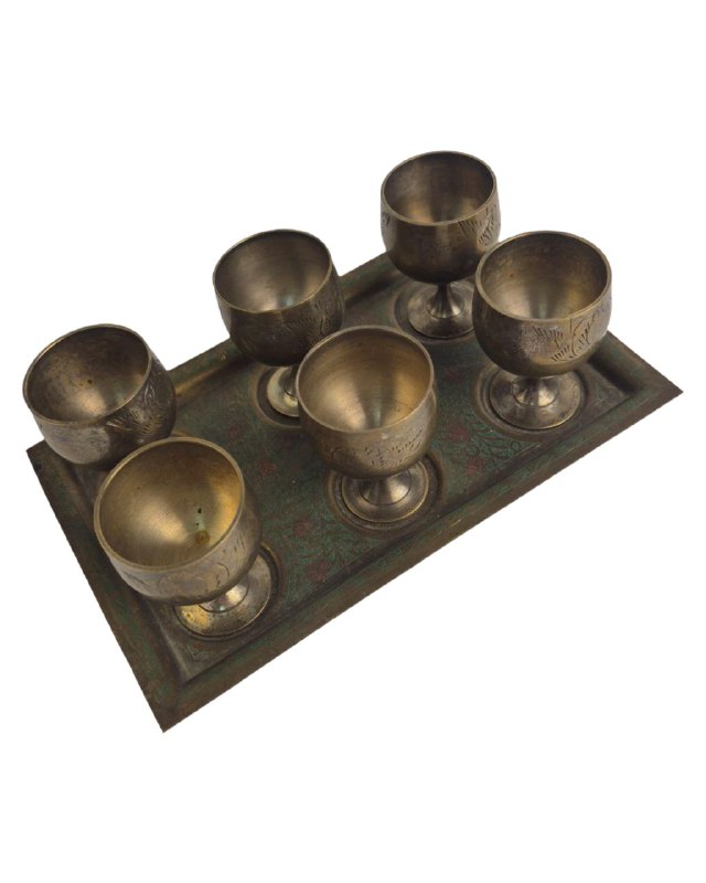 винтажный набор из шести миниатюрных кубков (рюмок) на подносе, выполненный в традиционном индийском стиле.