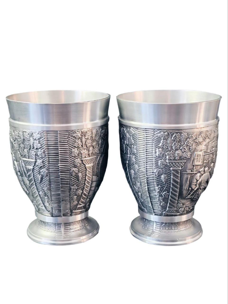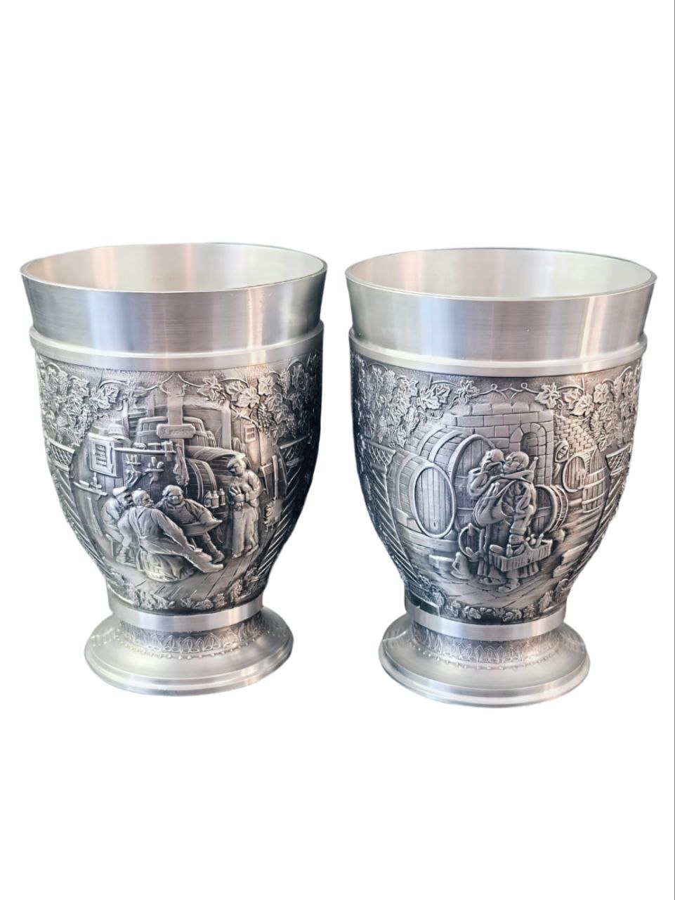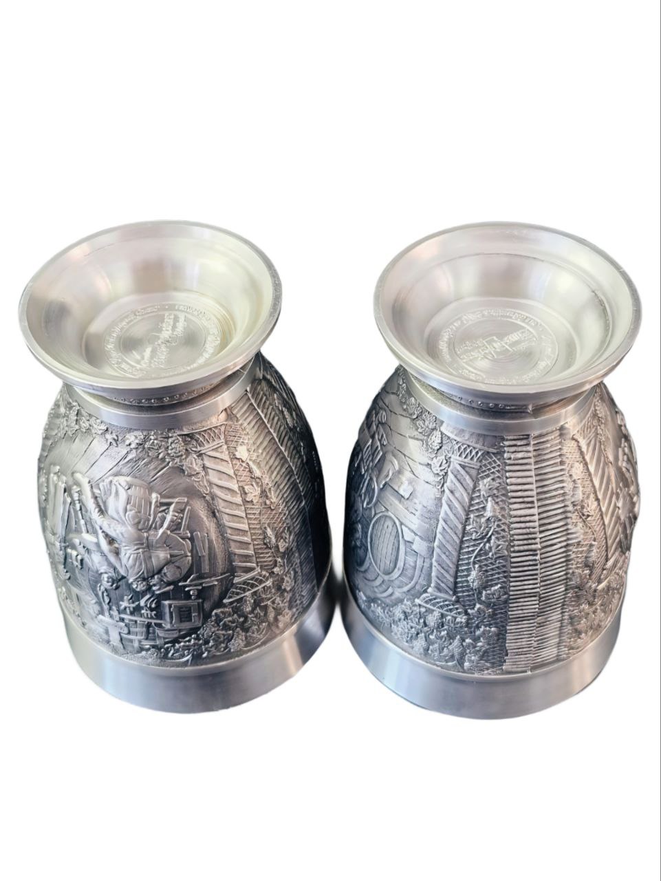 Пара винтажных оловянных бокалов с детальным рельефным изображением бытовой сцены в таверне.