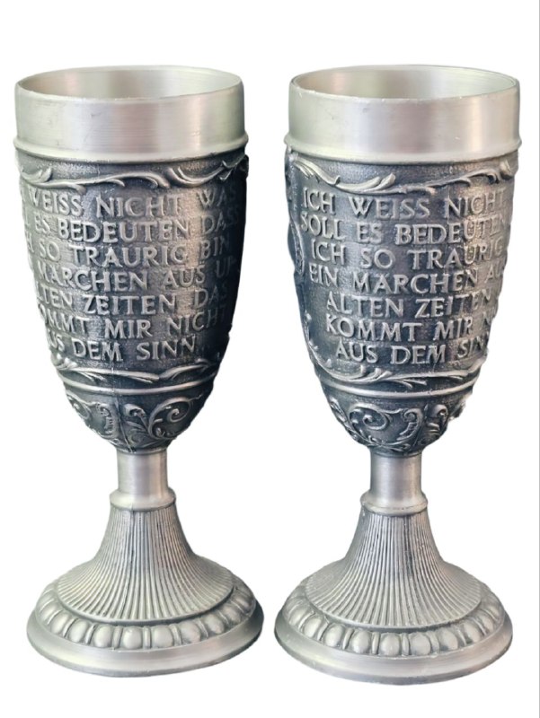 На изделиях изображены рельефные сцены. На одной стороне рюмки виден текст на немецком языке: "Ich weiß nicht, was soll es bedeuten..." — это первые строки знаменитого стихотворения Генриха Гейне «Лорелей». На второй стороне рюмки изображена сама дева Лорелей, расчесывающая волосы на скале над Рейном.