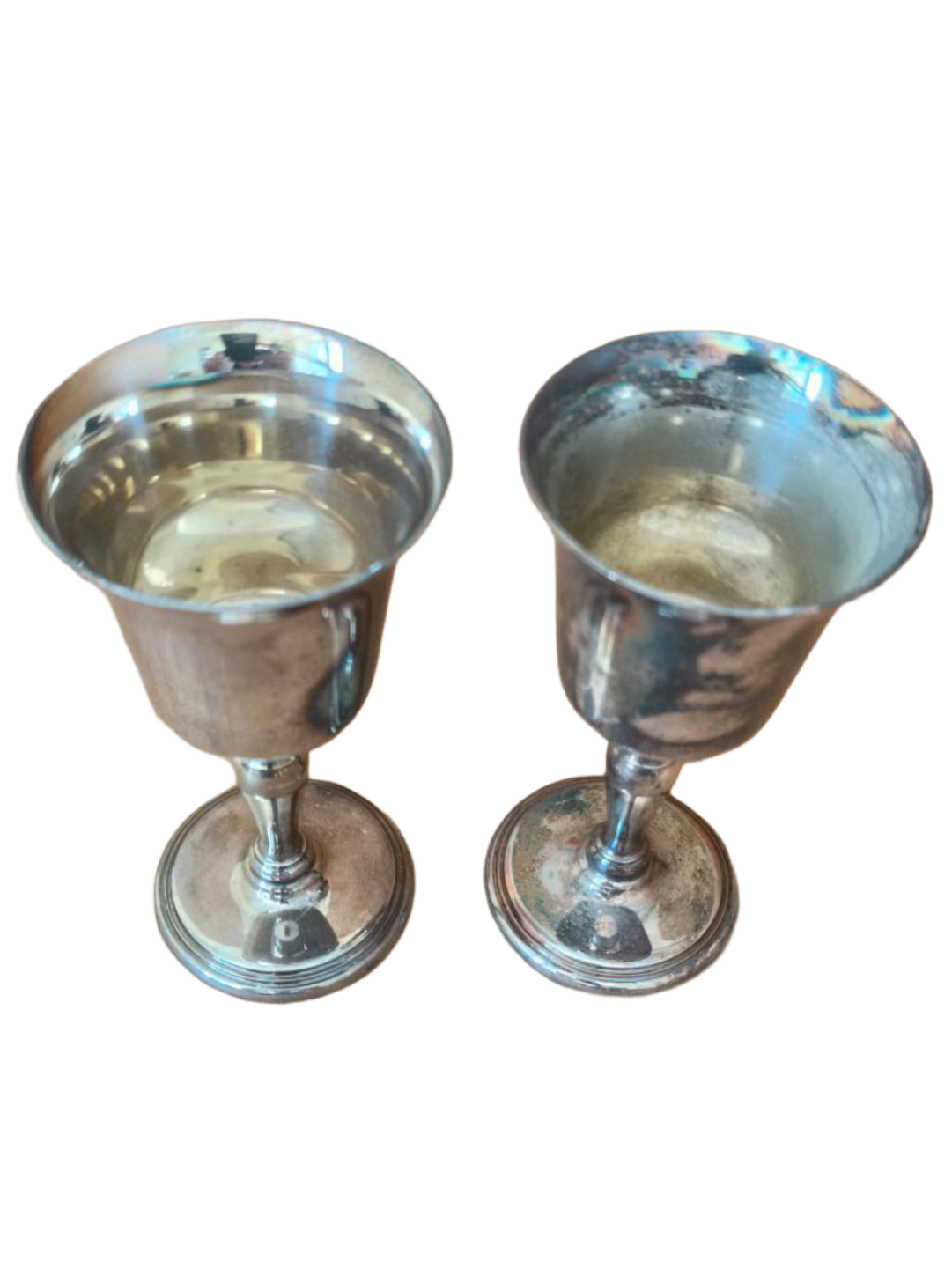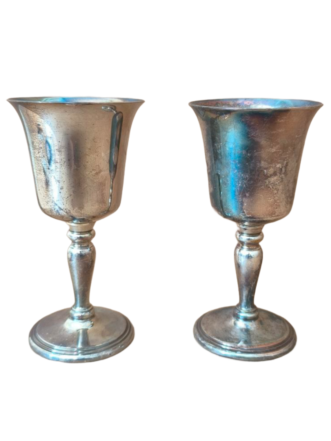Представлено вашему вниманию коллекционные посеребренные кубки (бокалы), которые часто использовались для вина или в ритуальных целях. Подобные изделия характеризуются классической формой с расширяющейся чашей и фигурной ножкой на круглом основании.