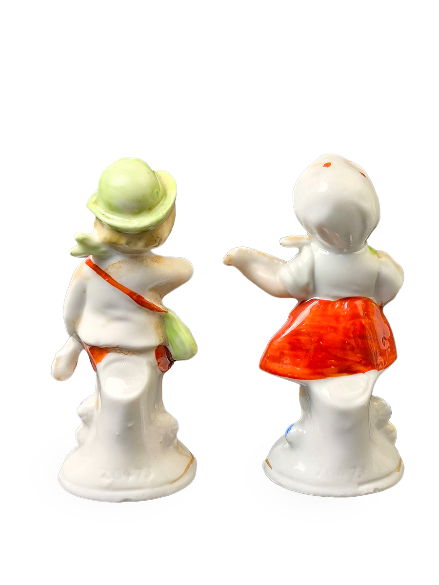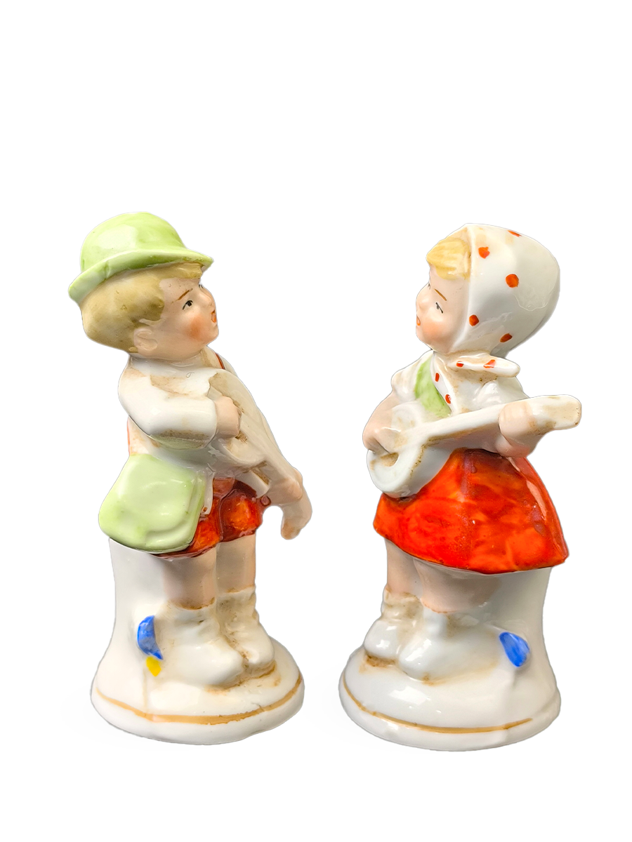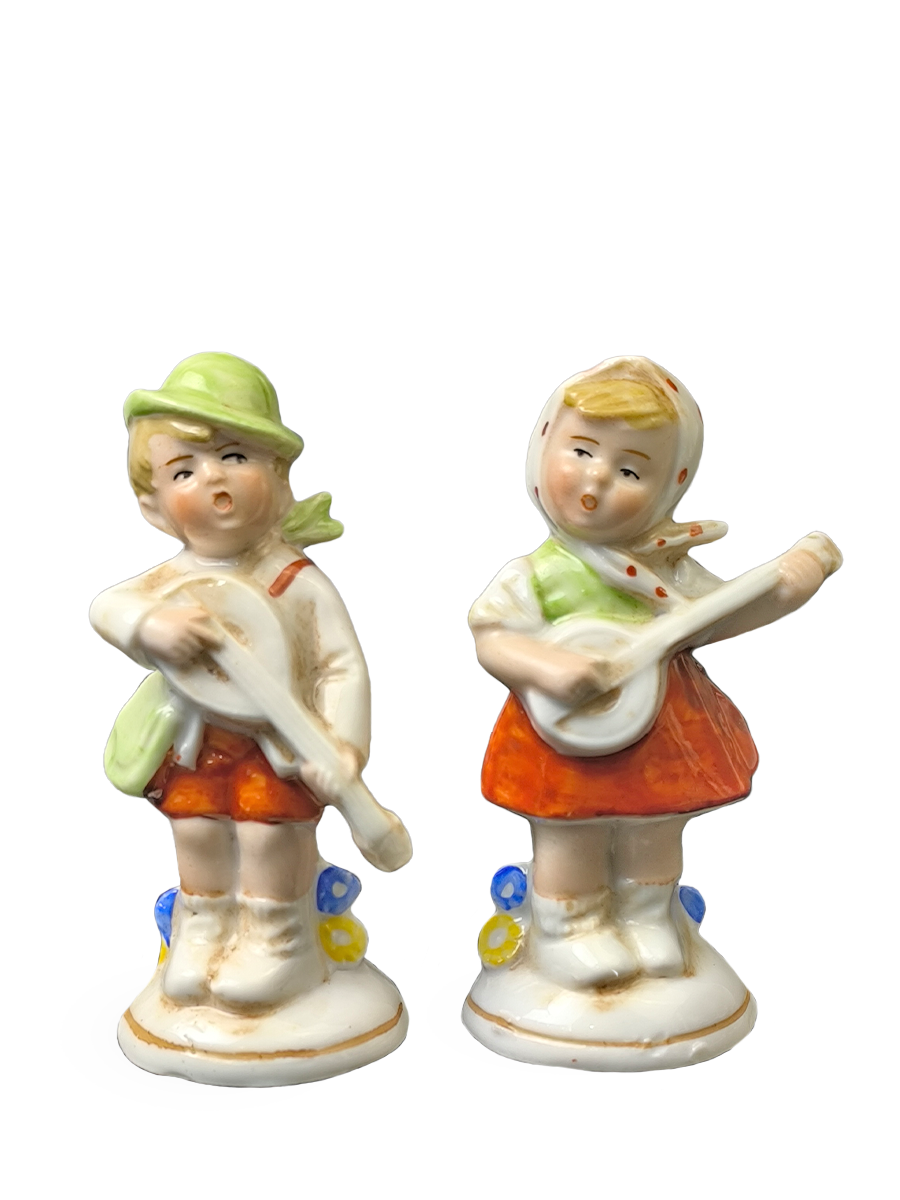 Две фарфоровые статуэтки, изображающие мальчика и девочку, играющих на музыкальных инструментах, вероятно, мандолинах или банджо. Обе фигурки одеты в традиционную одежду и стоят на круглых основаниях.