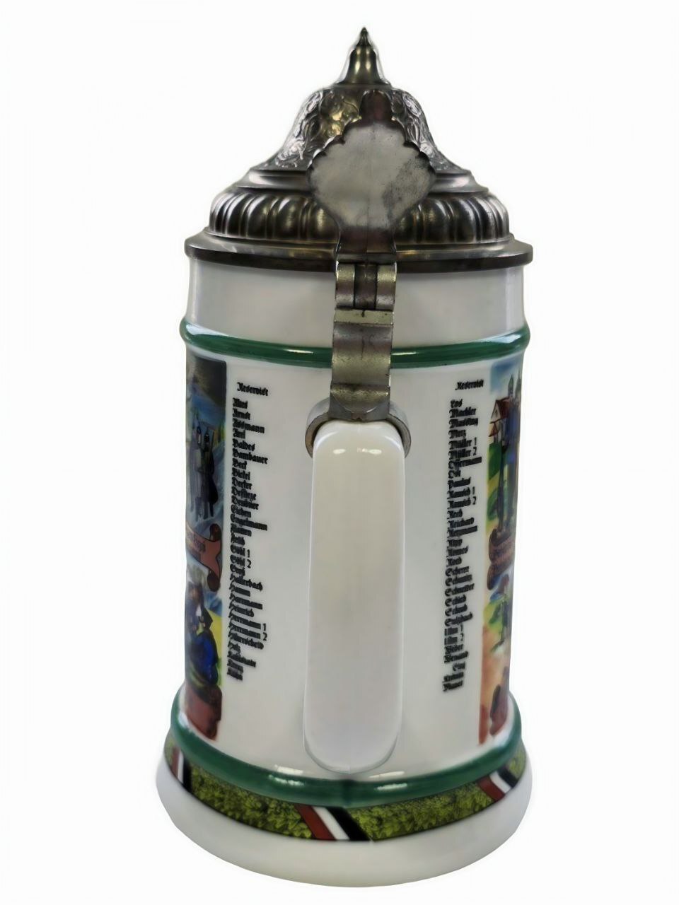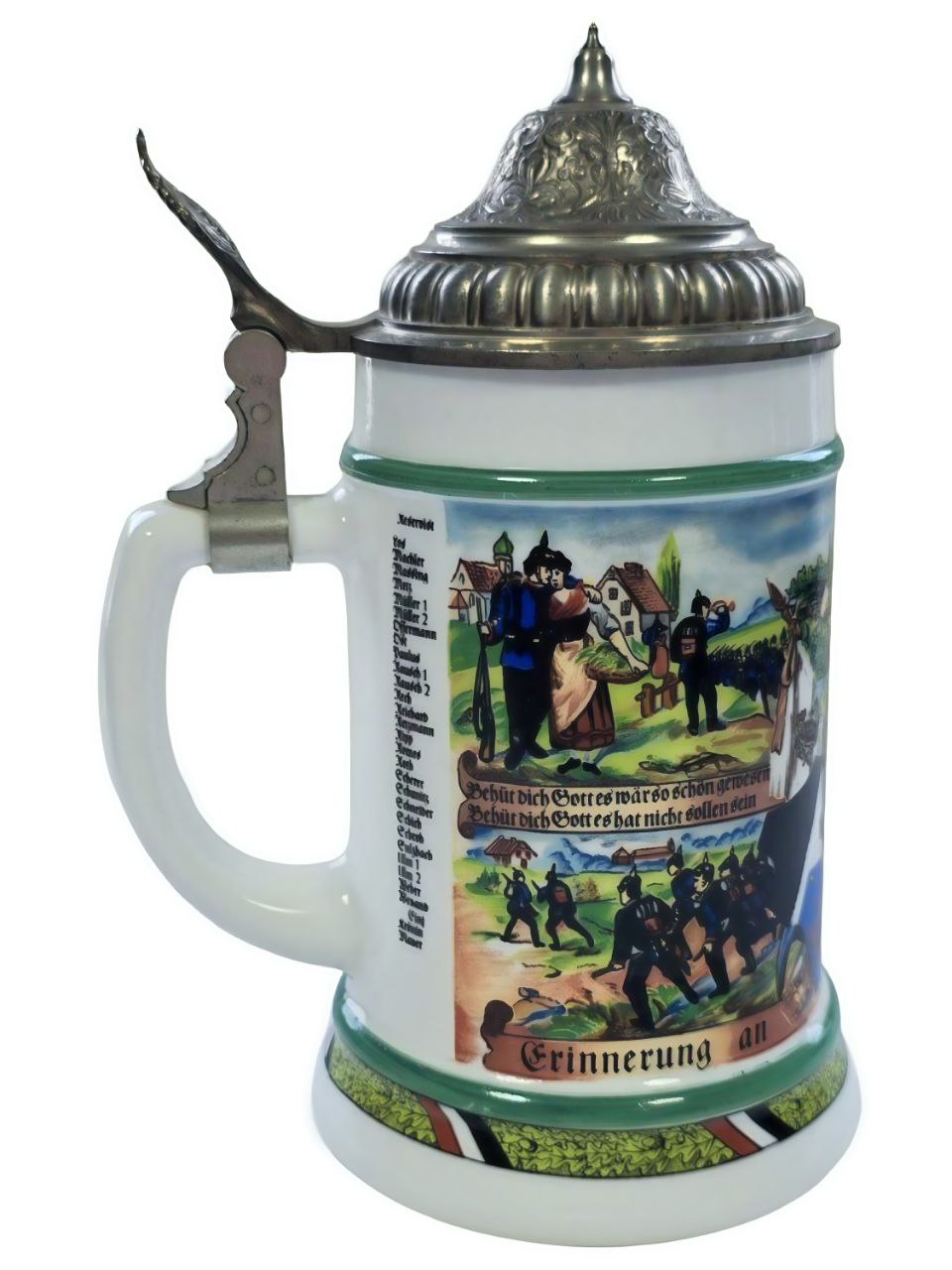 На кружке изображён дизайн немецкого военного полка, имена солдат на обеих задних сторонах возле ручки.