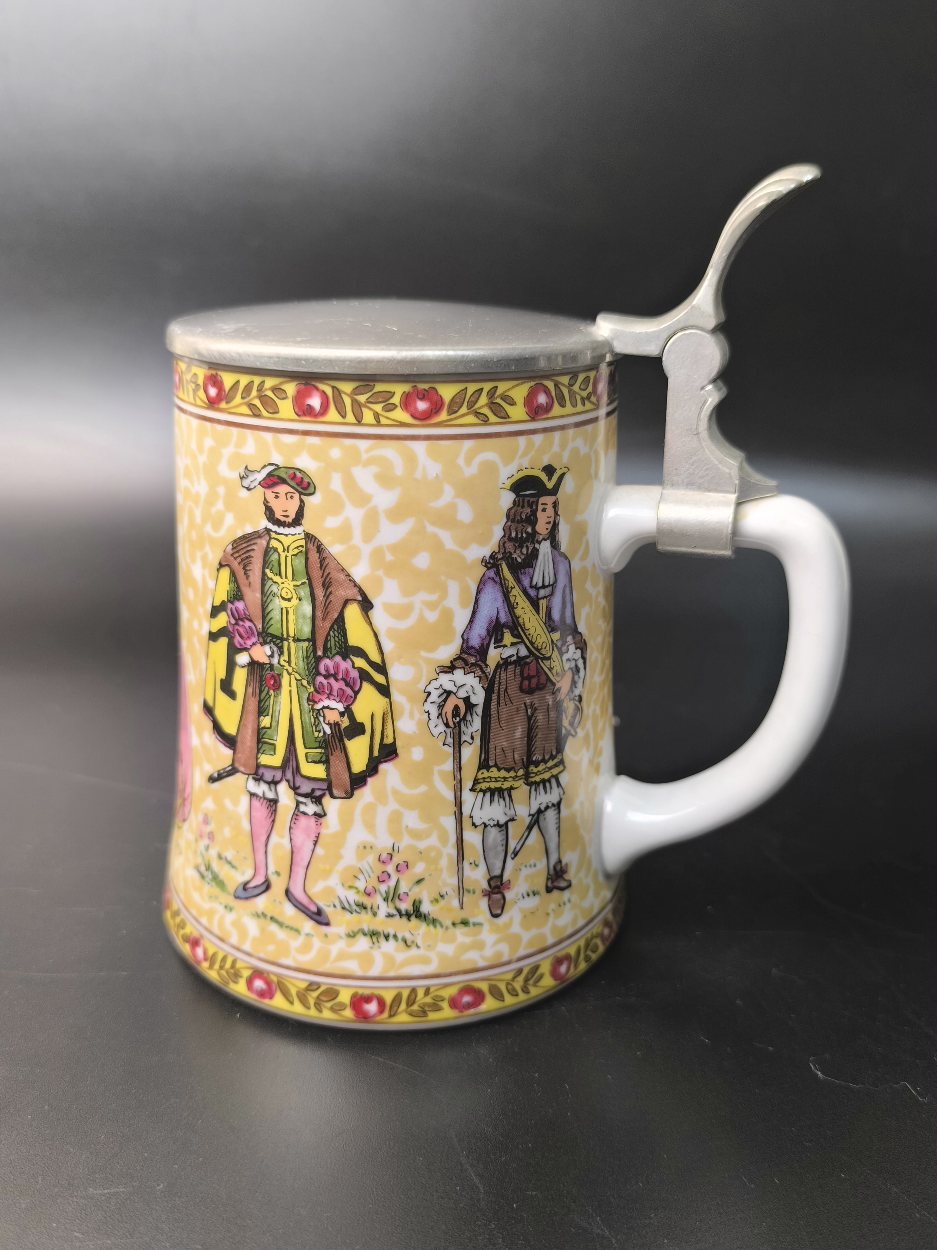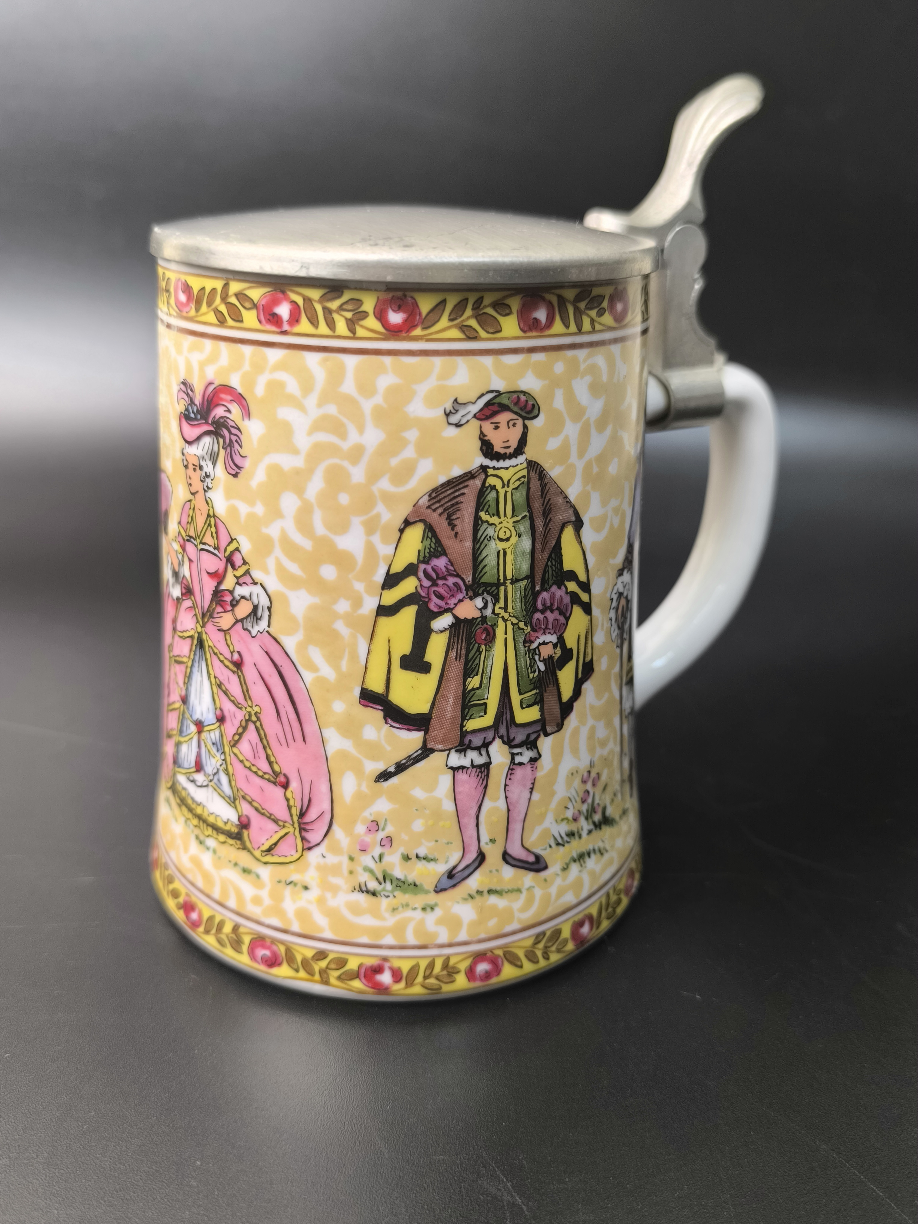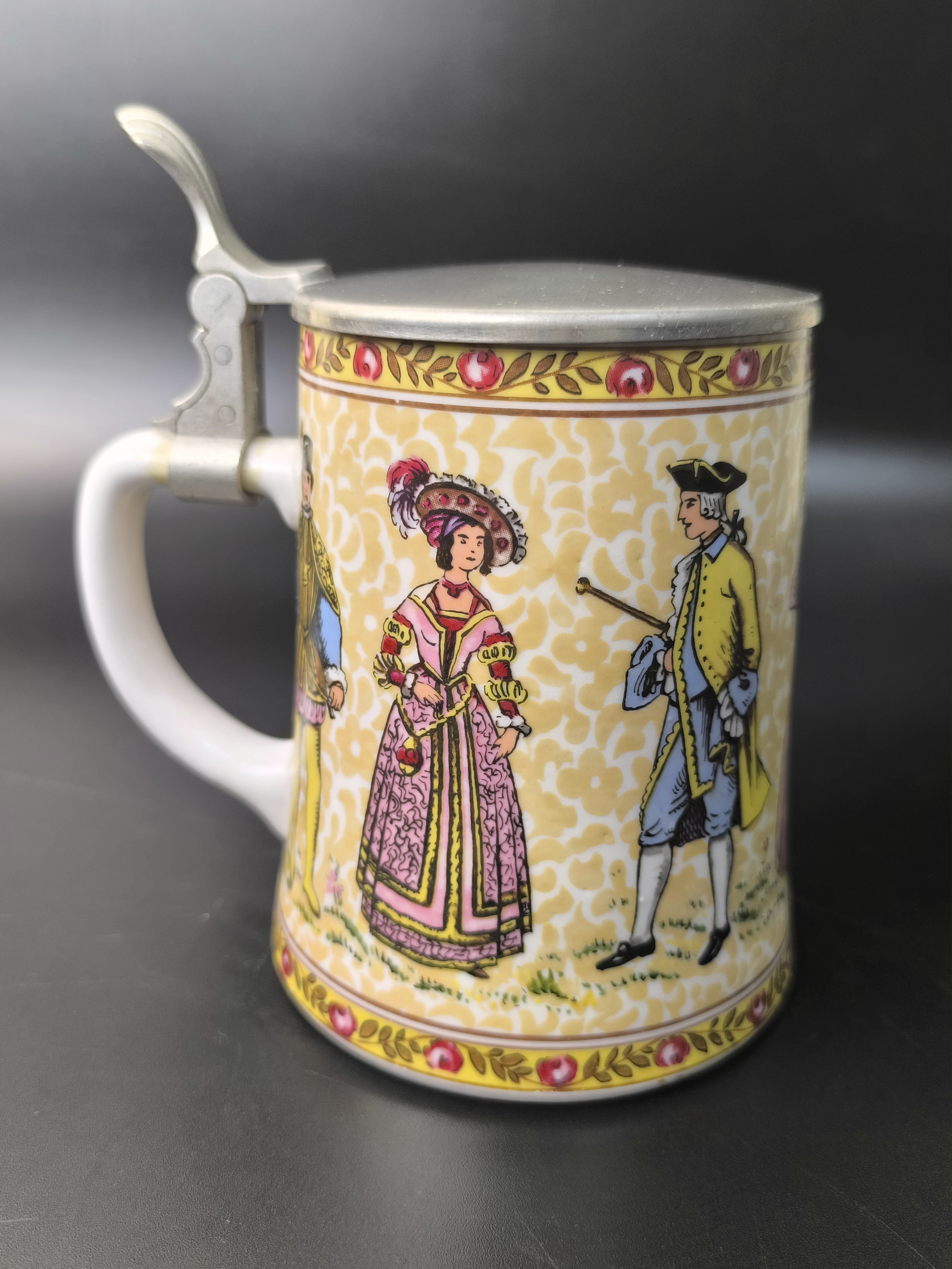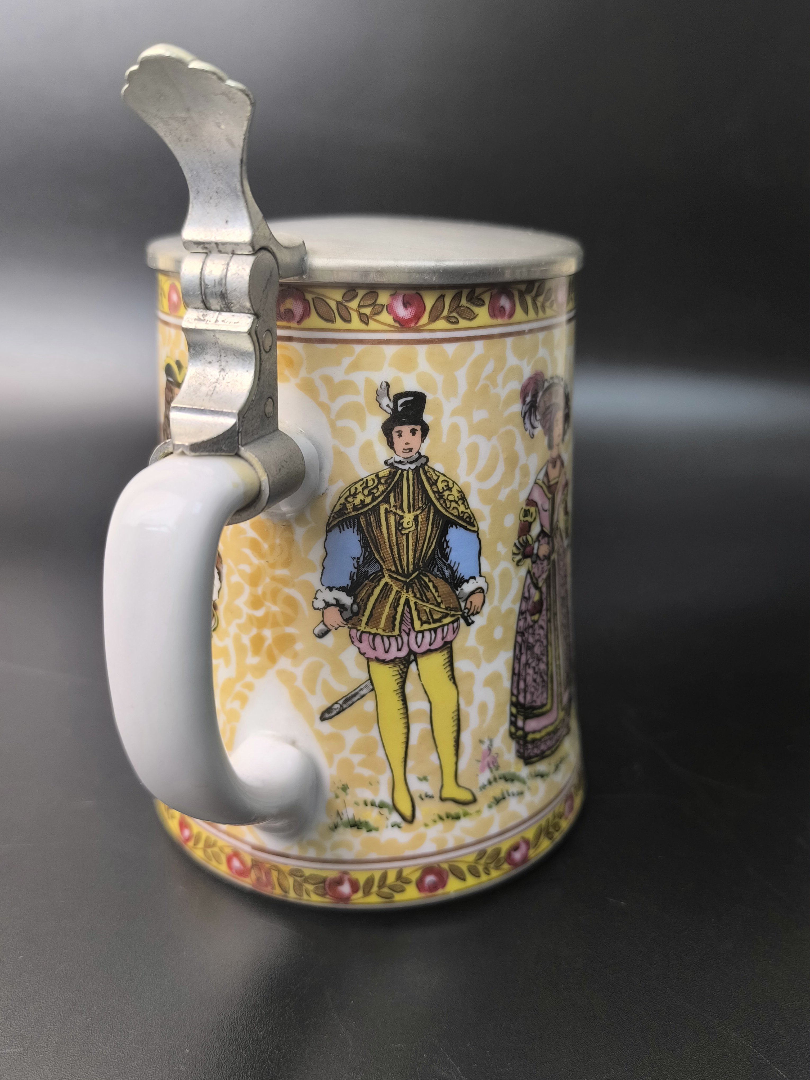 Пивная кружка "Светский раут, "Бал" с оловянной крышкой от фарфоровой мануфактуры König, BMF Keramik. Основана Бернхардом Кёнигом и продолжается его детьми Гердом Кёнигом и Ренатой Шёрнер по сей день. Изготовлена вручную в Германии.