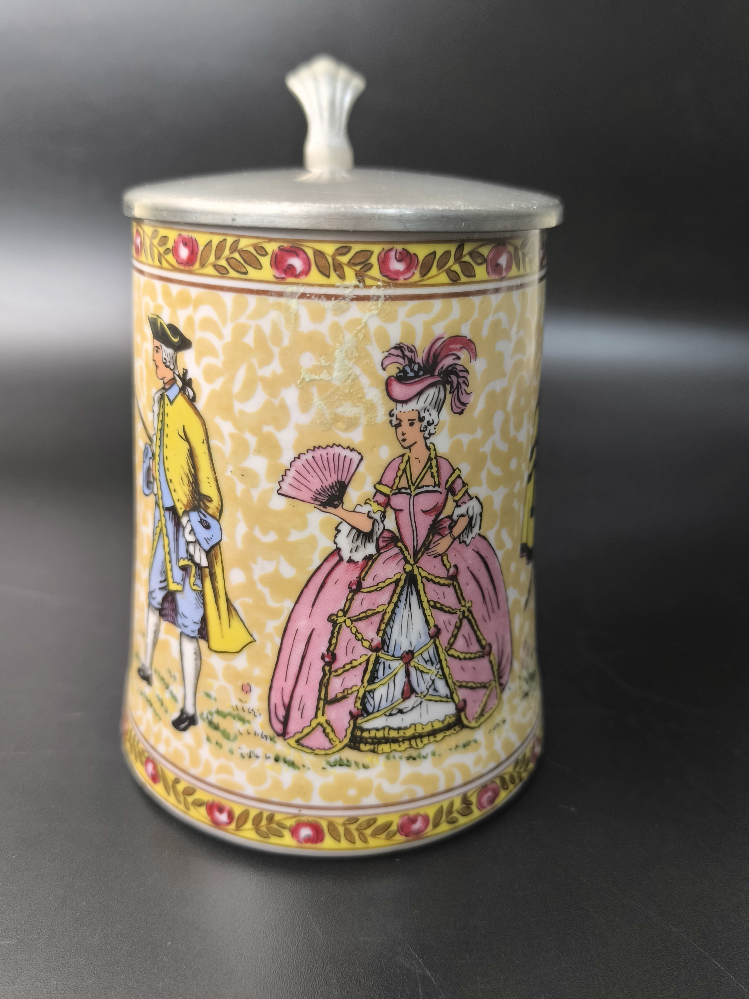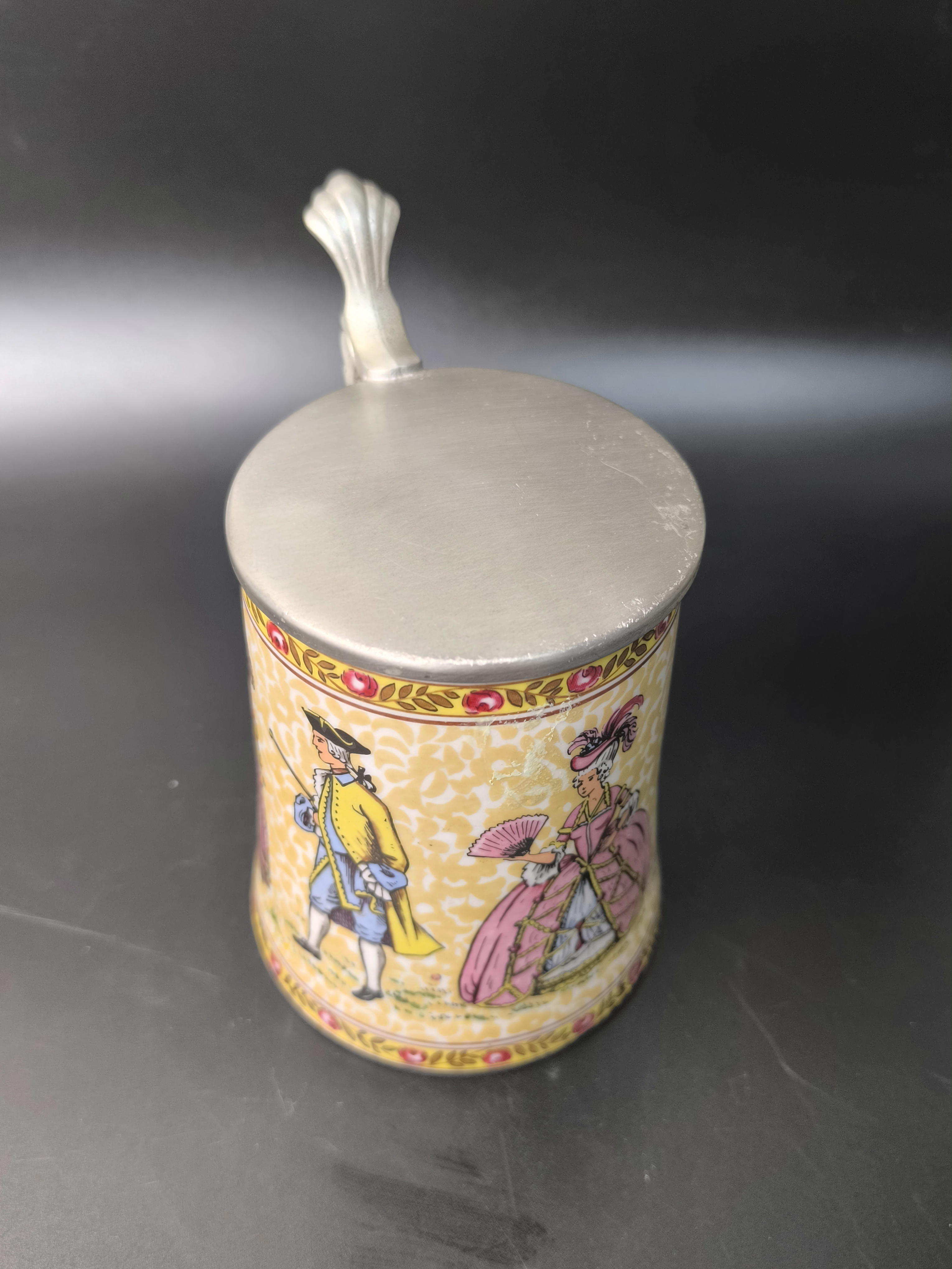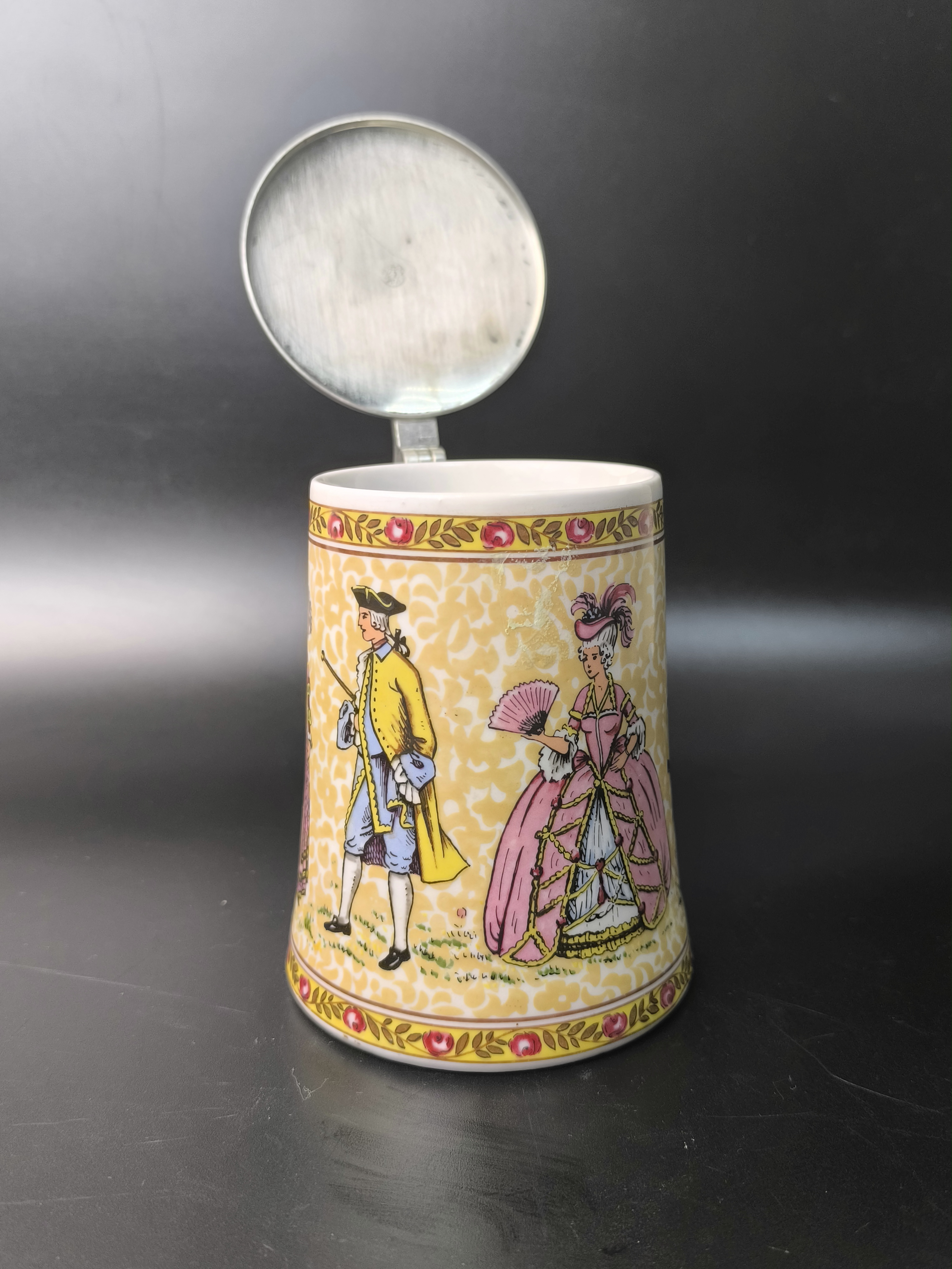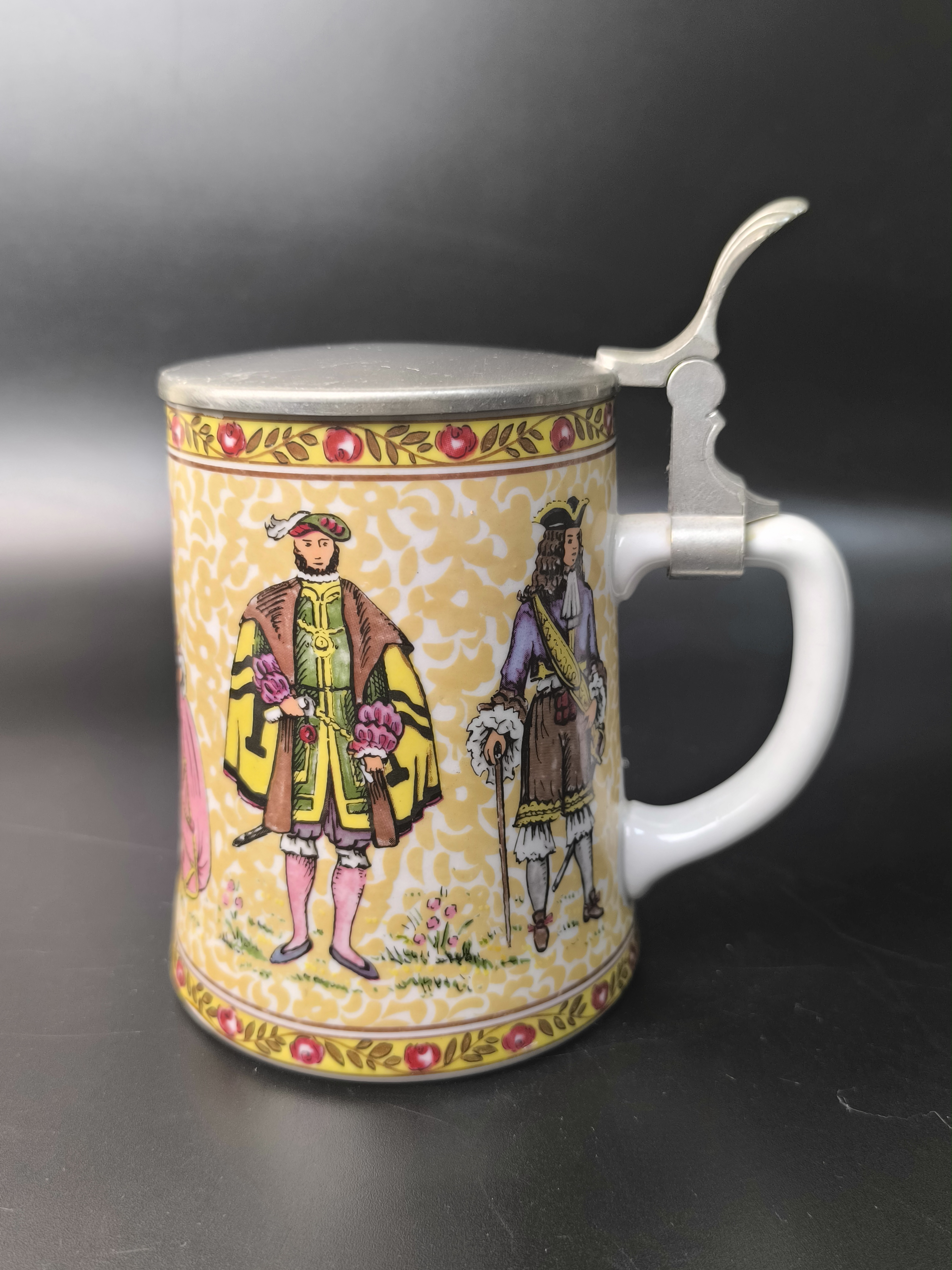 Пивная кружка "Светский раут, "Бал" с оловянной крышкой от фарфоровой мануфактуры König, BMF Keramik. Основана Бернхардом Кёнигом и продолжается его детьми Гердом Кёнигом и Ренатой Шёрнер по сей день. Изготовлена вручную в Германии.
