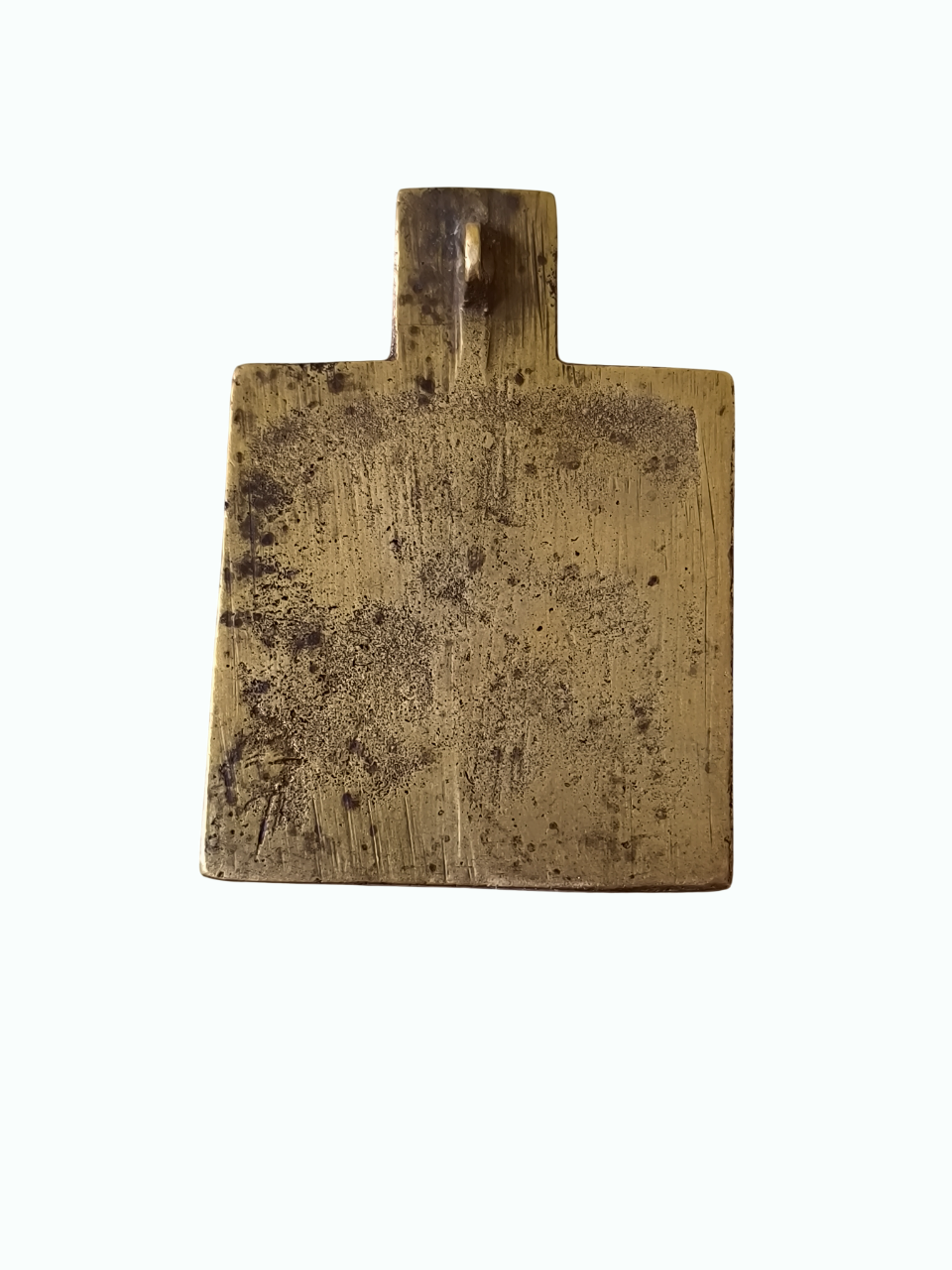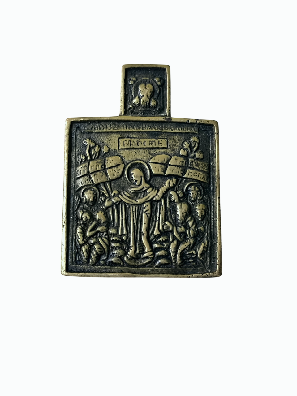 Антикварная вершковая икона-плакетка "Богоматерь всех скорбящих радость и Образ Спаса на плате". Латунная икона, изготовленная в 19 веке. Данный Образ Богоматери - один из самых распространённых в русском литье. К этому Образу обращаются в минуты страданий и скорби, как душевных, так и телесных. В центре находится Богоматерь, правой рукой благословляющая людей, также на композиции имеются ангелы. В верхней части - Образ Иисуса Христа. Сверху основной плакетки имеется навершие с Образом Спаса Нерукотворного. Данная икона - очень частый вариант, изготовлявшийся огромными тиражами.