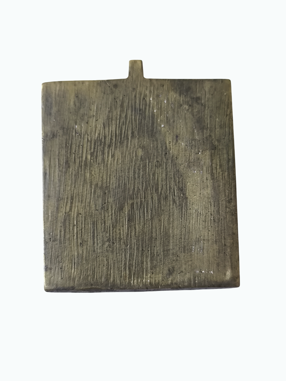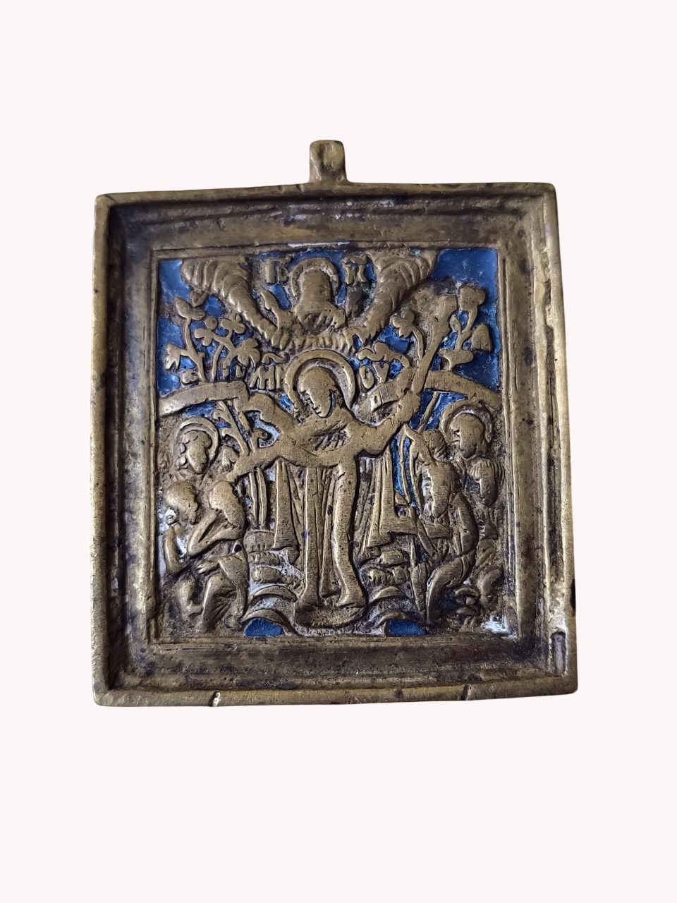 Антикварная вершковая икона-плакетка "Богоматерь всех скорбящих радость". Латунная икона, изготовленная в 19 веке. Данный Образ Богоматери - один из самых распространённых в русском литье. К этому Образу обращаются в минуты страданий и скорби, как душевных, так и телесных. В центре находится Богоматерь, правой рукой благословляющая людей, также на композиции имеются ангелы. В верхней части - Образ Иисуса Христа. Данная икона - очень частый вариант, изготовлявшийся огромными тиражами.