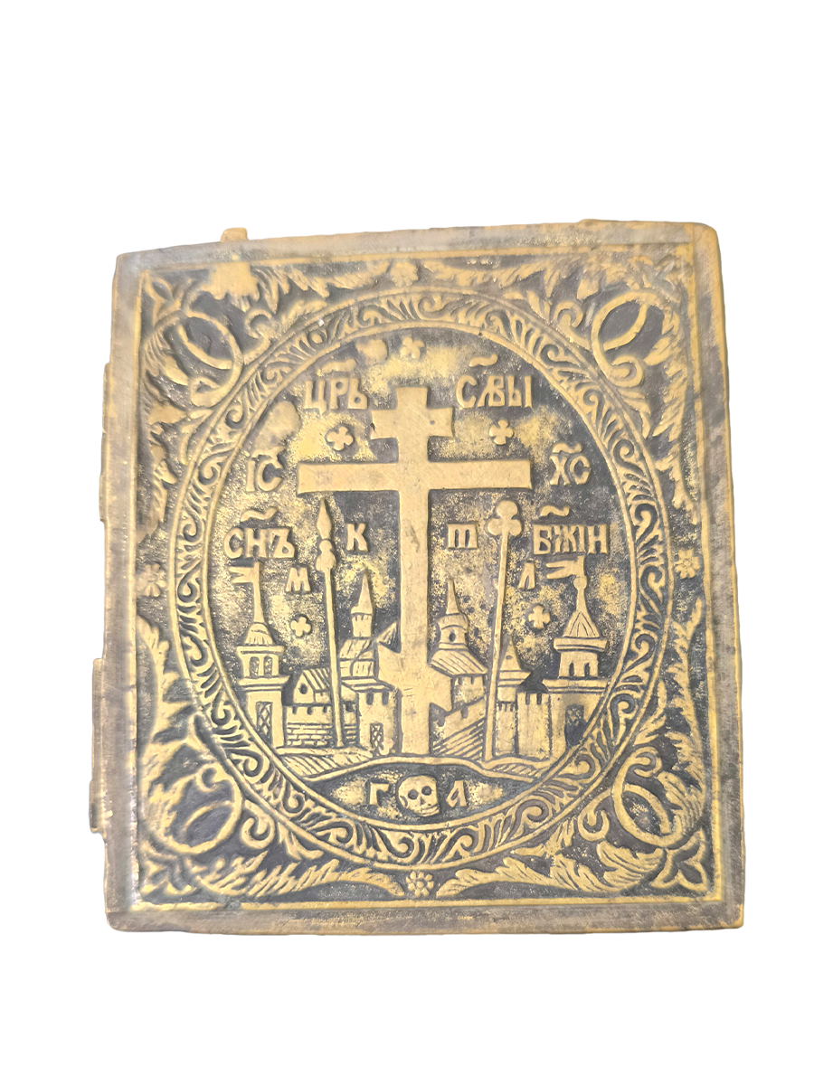 На оборотной стороне титульной створки расположено рельефное изображение Голгофского Креста и Града Иерусалима в овальном медальоне.