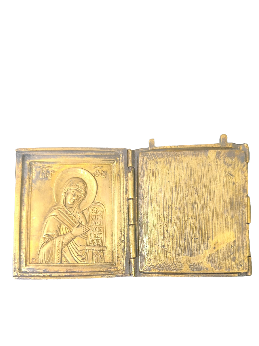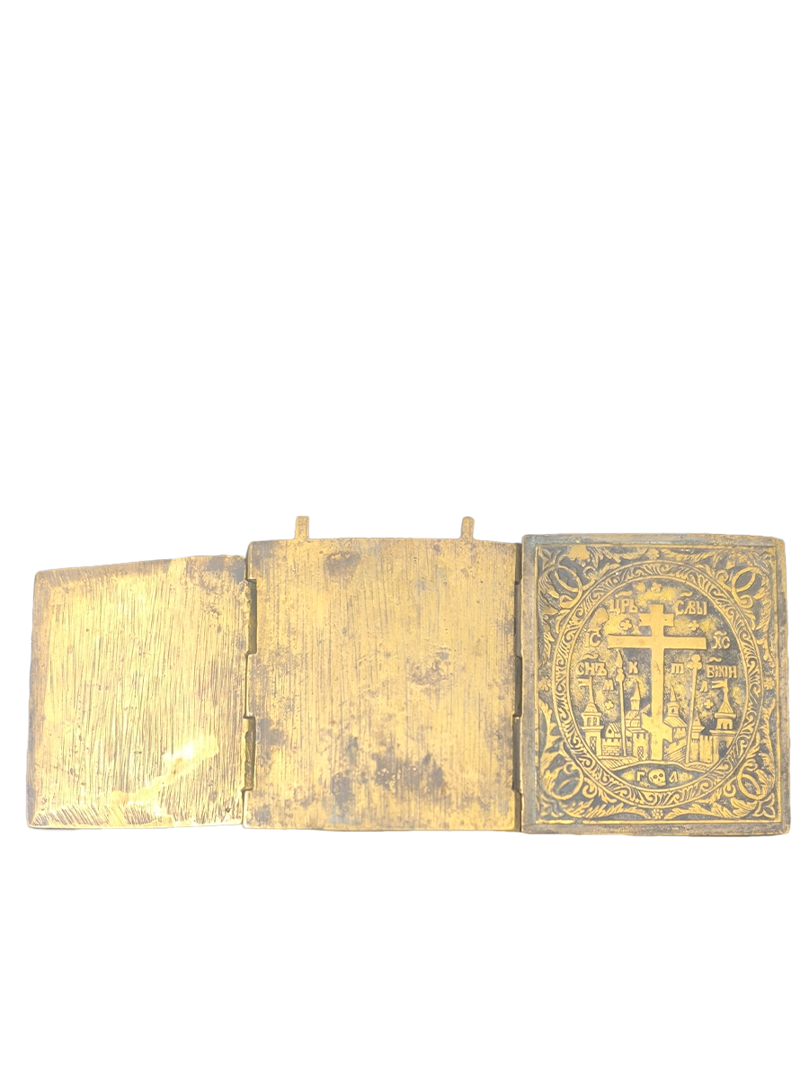 Состояние отличное: геометрия складня и створок существенно не нарушена; петли в отличном состоянии; штифты складня латунные крепкие в отличном состоянии; внутренний и внешний рельеф створок в хорошем состоянии.