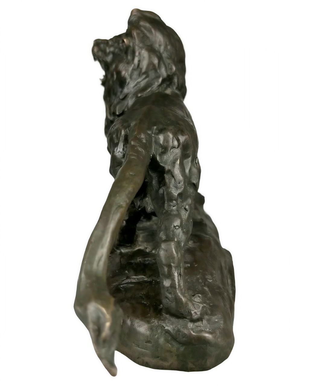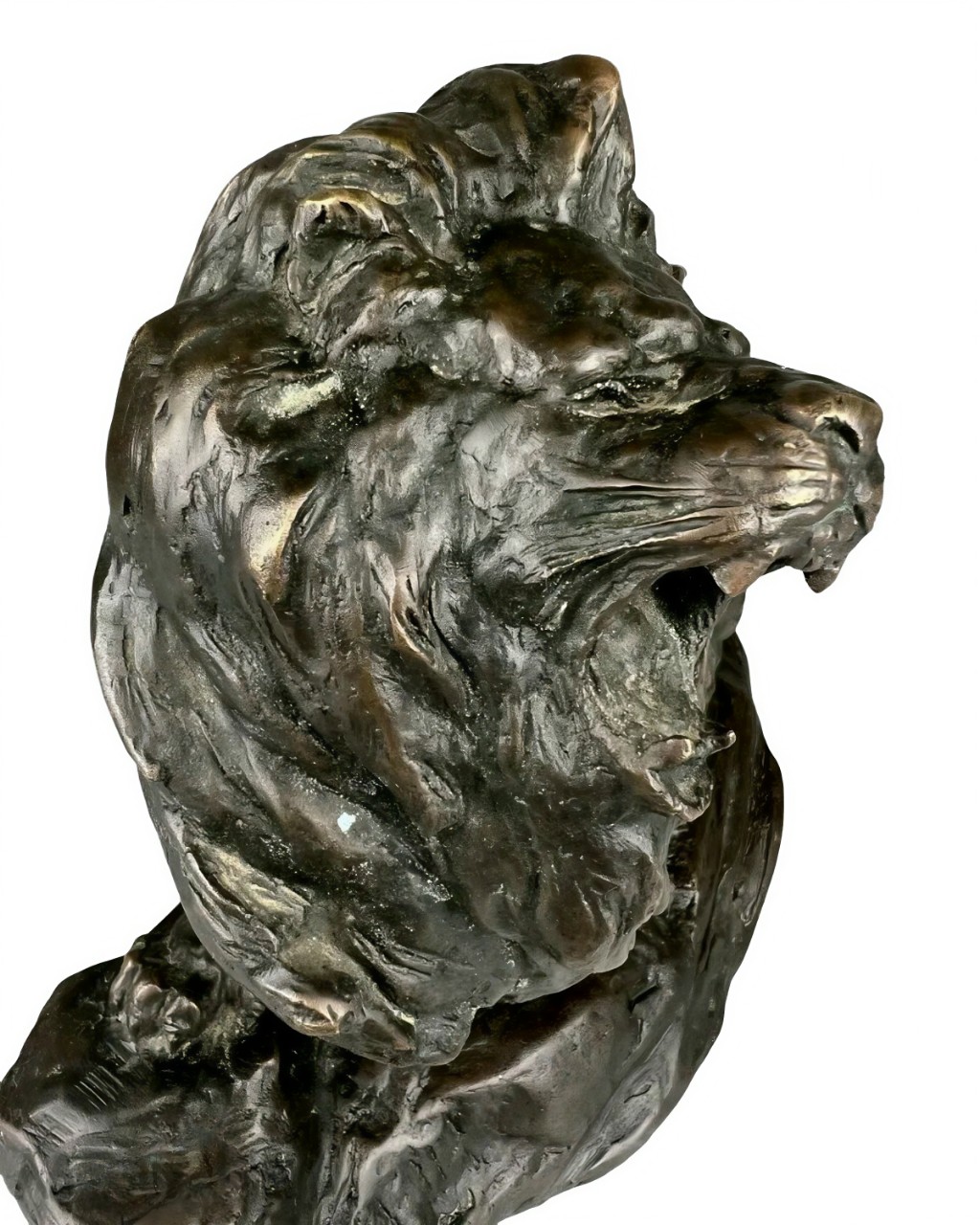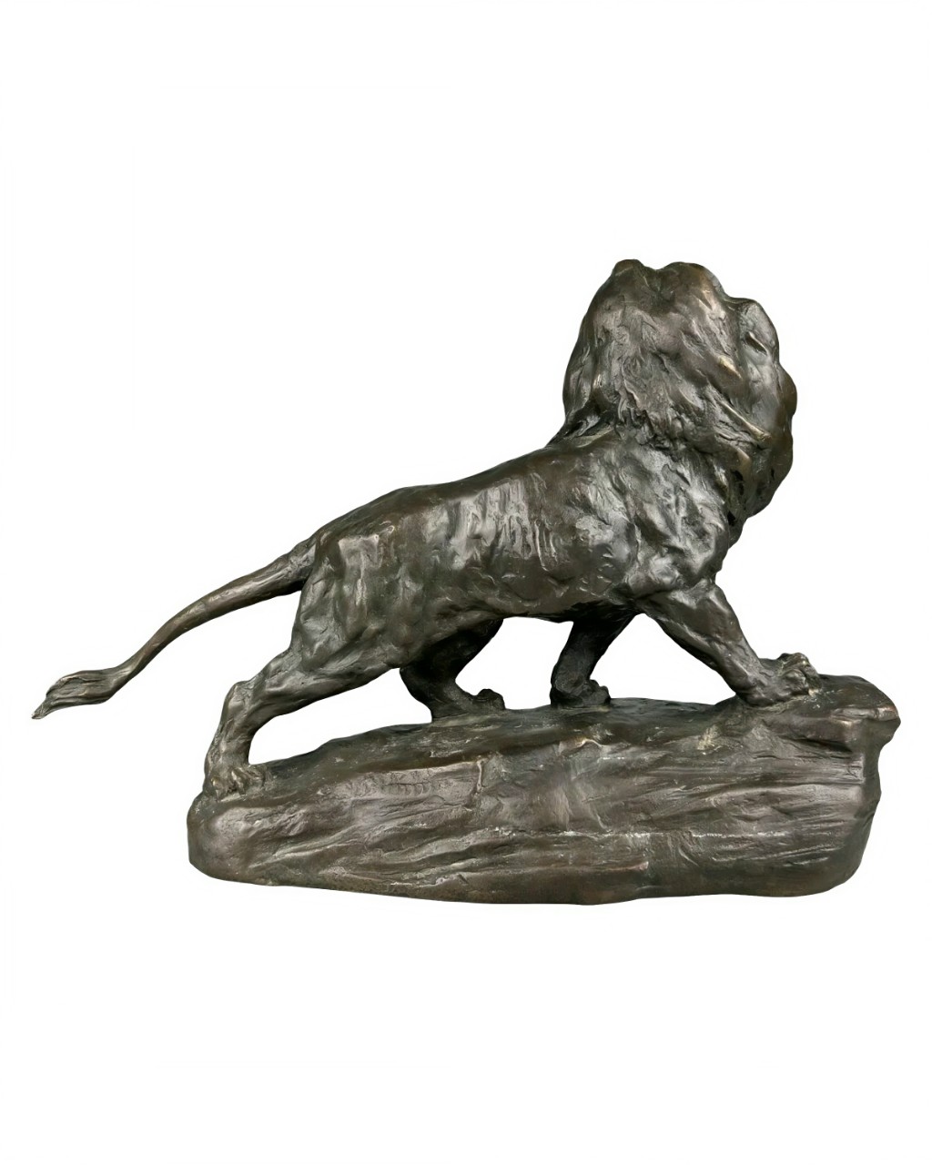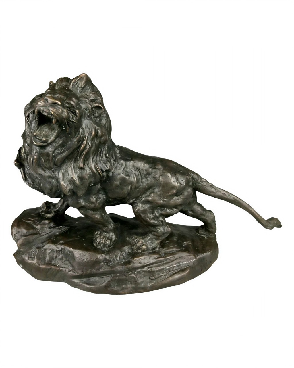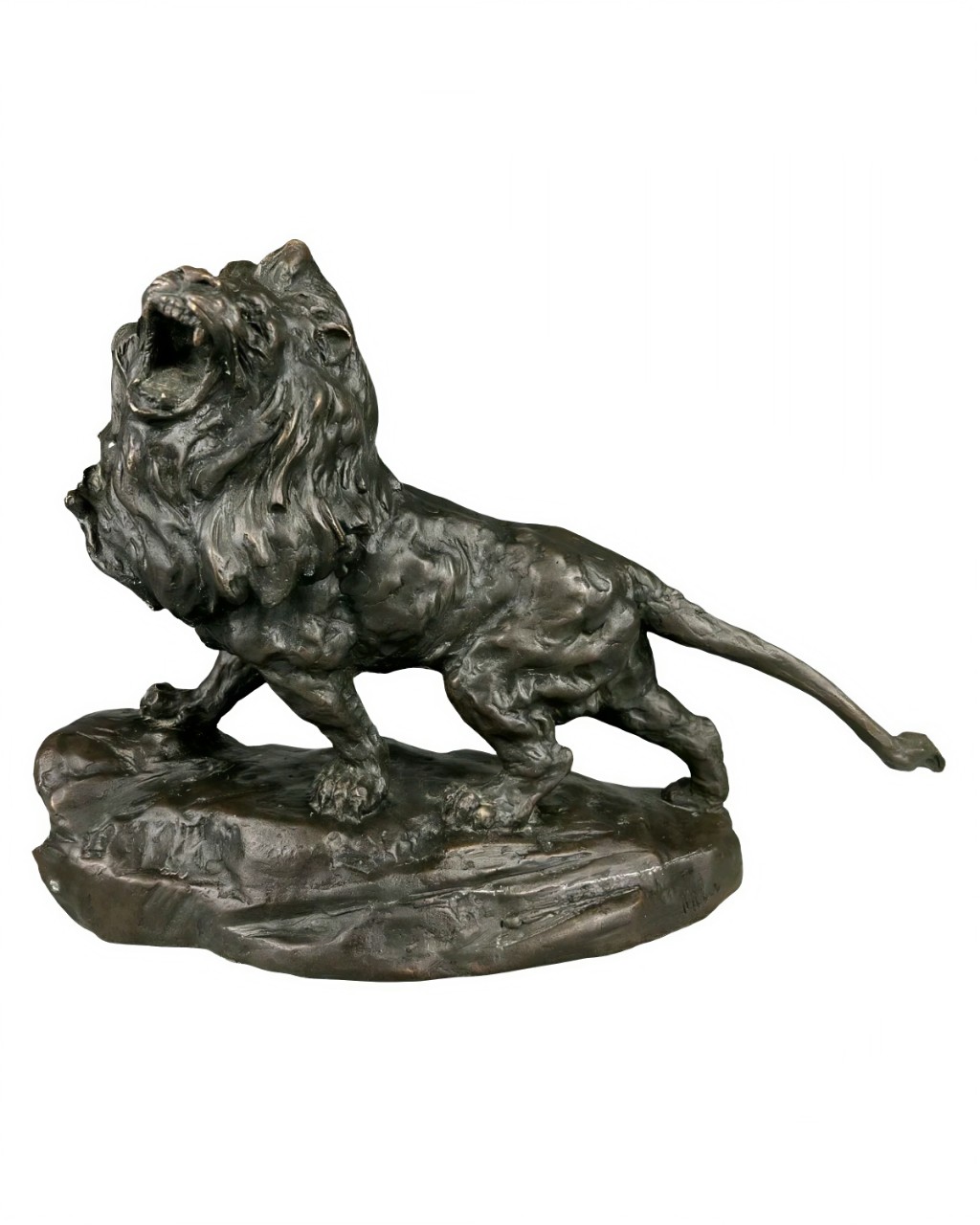Антикварная бронзовая скульптура изображает мощного льва с густой гривой, стоящего на каменистом основании в экспрессивной позе с открытой пастью, издающего грозный рык.