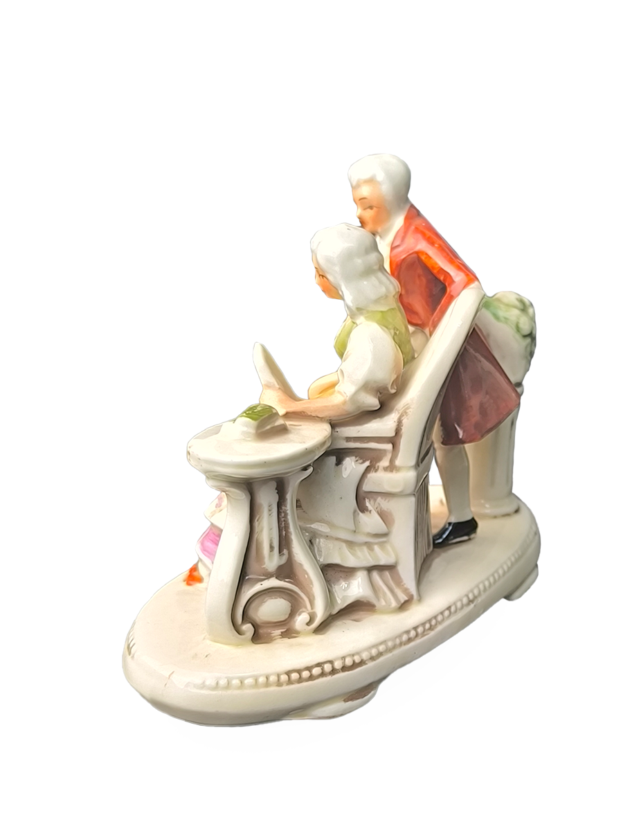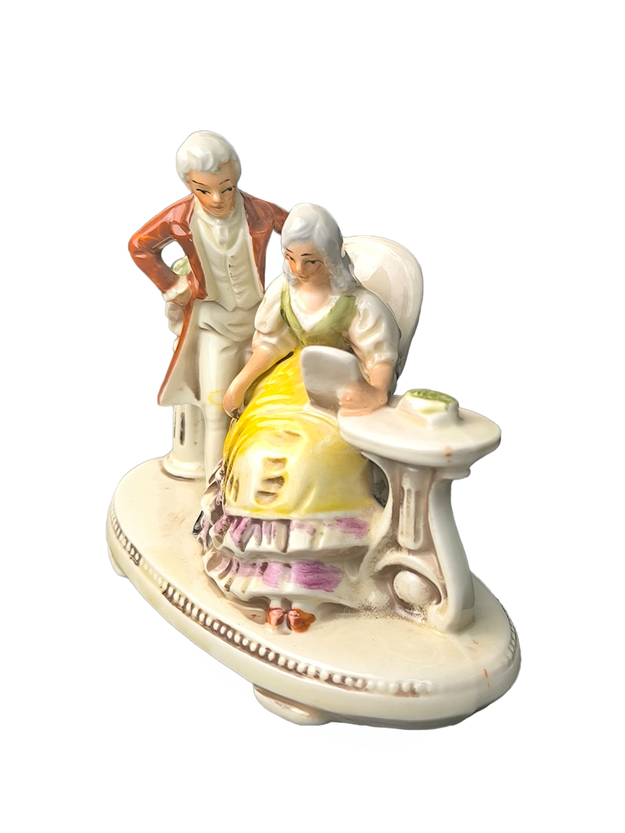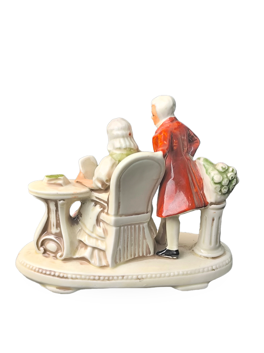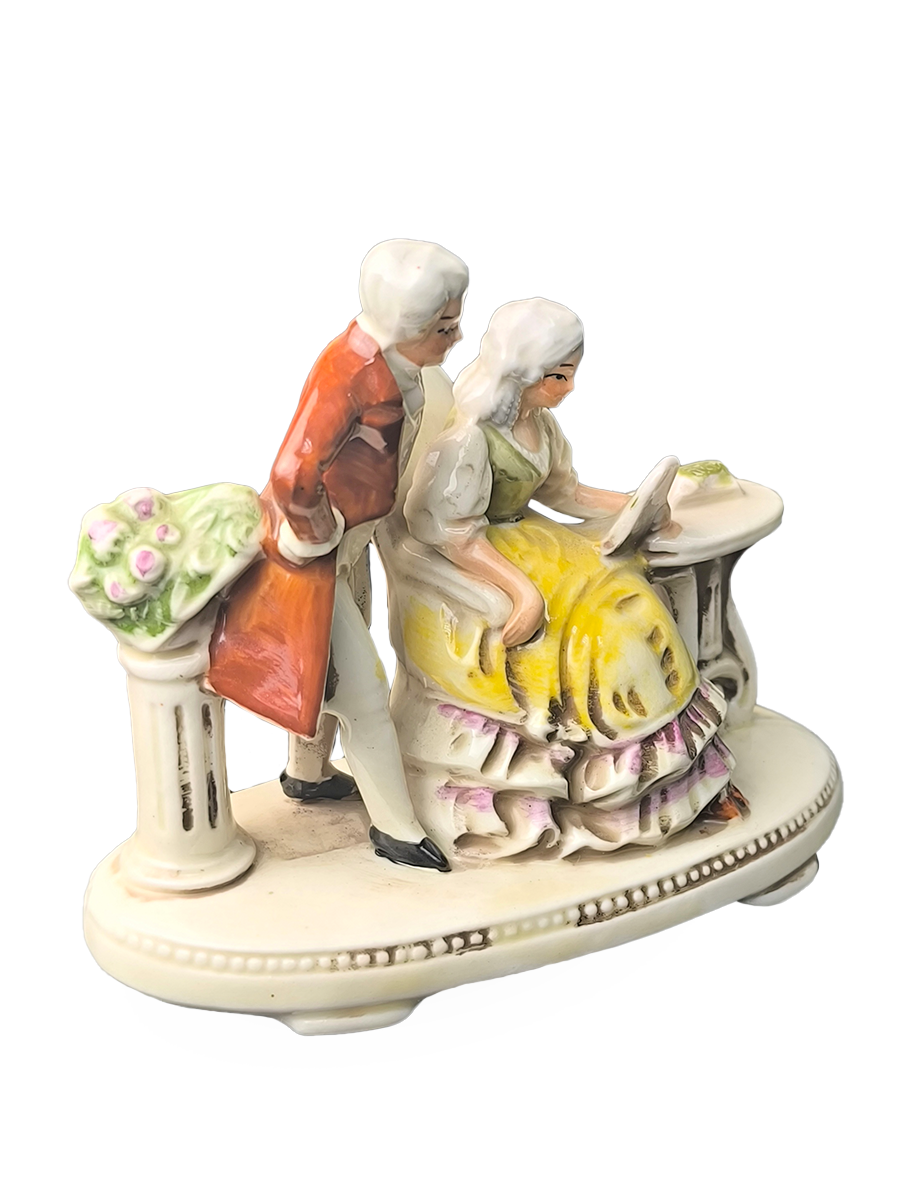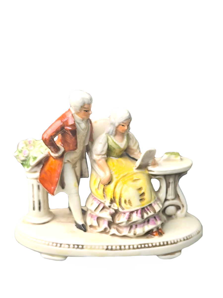 Статуэтка изображает кавалера в красном камзоле и даму в желтом платье, которые вместе увлеченно читают письмо, сидя за небольшим столиком.